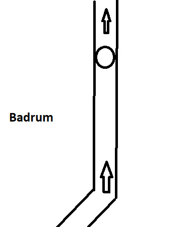 Jag lägger upp lite fula paint-bilder på hur det ser ut samt ett foto från badrummet. Rödmarkeringen på fotot är där grannen har sin ventil. Det röda röret på paint-bilden från köket är det som fortsätter in i badrummet. Kök och badrum är vägg i vägg. Överst i paintskissen över badrummet är ut från lägenheten och nederst är mot köket.