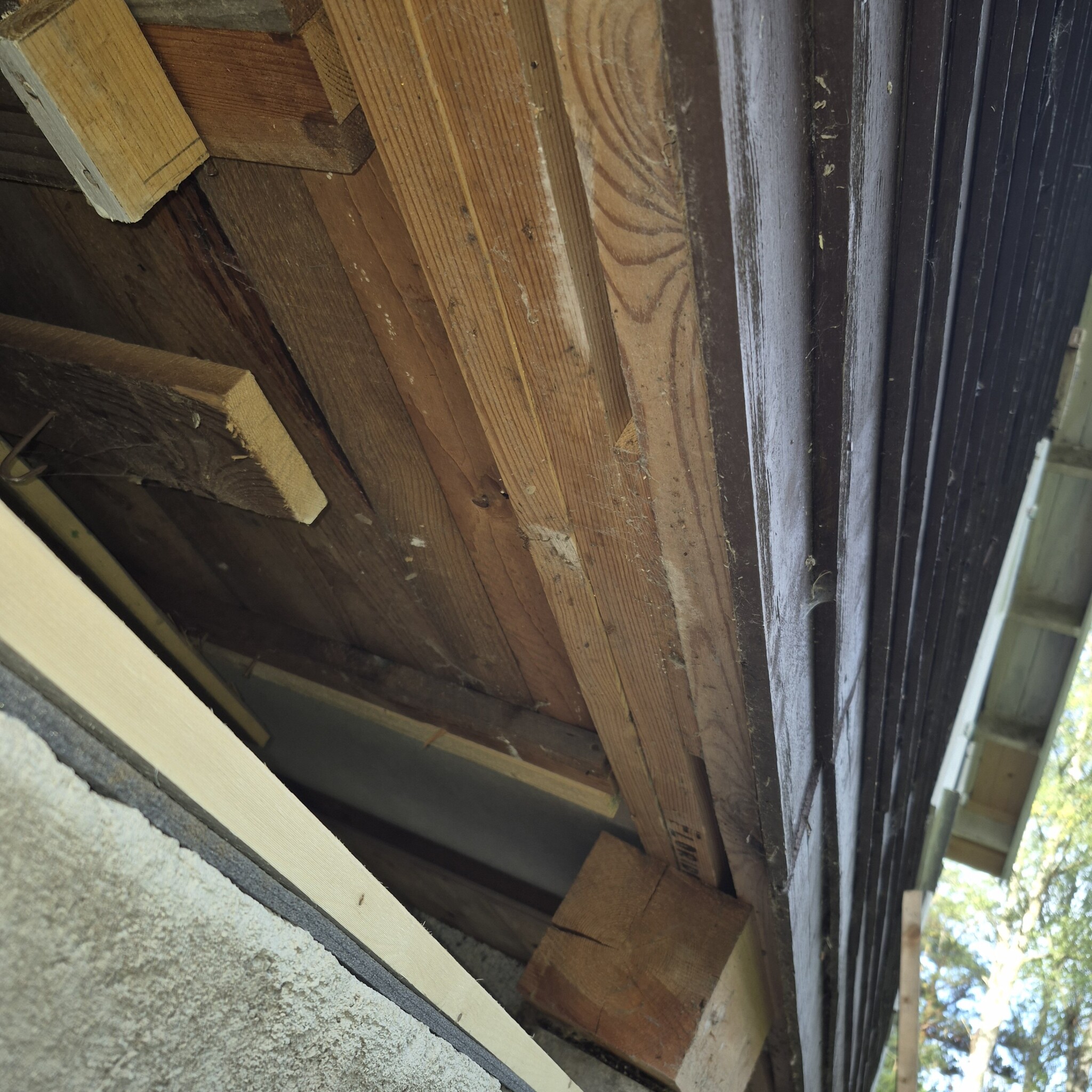 Det är fritidshus -66, fjällpanel, med typ 7cm isolering. Denna springa på några centimeter sitter runt hela huset. Ser helt klart ut som att man byggt ut den med distanser. Men när man tittar in där ser det ut att ta stopp.
