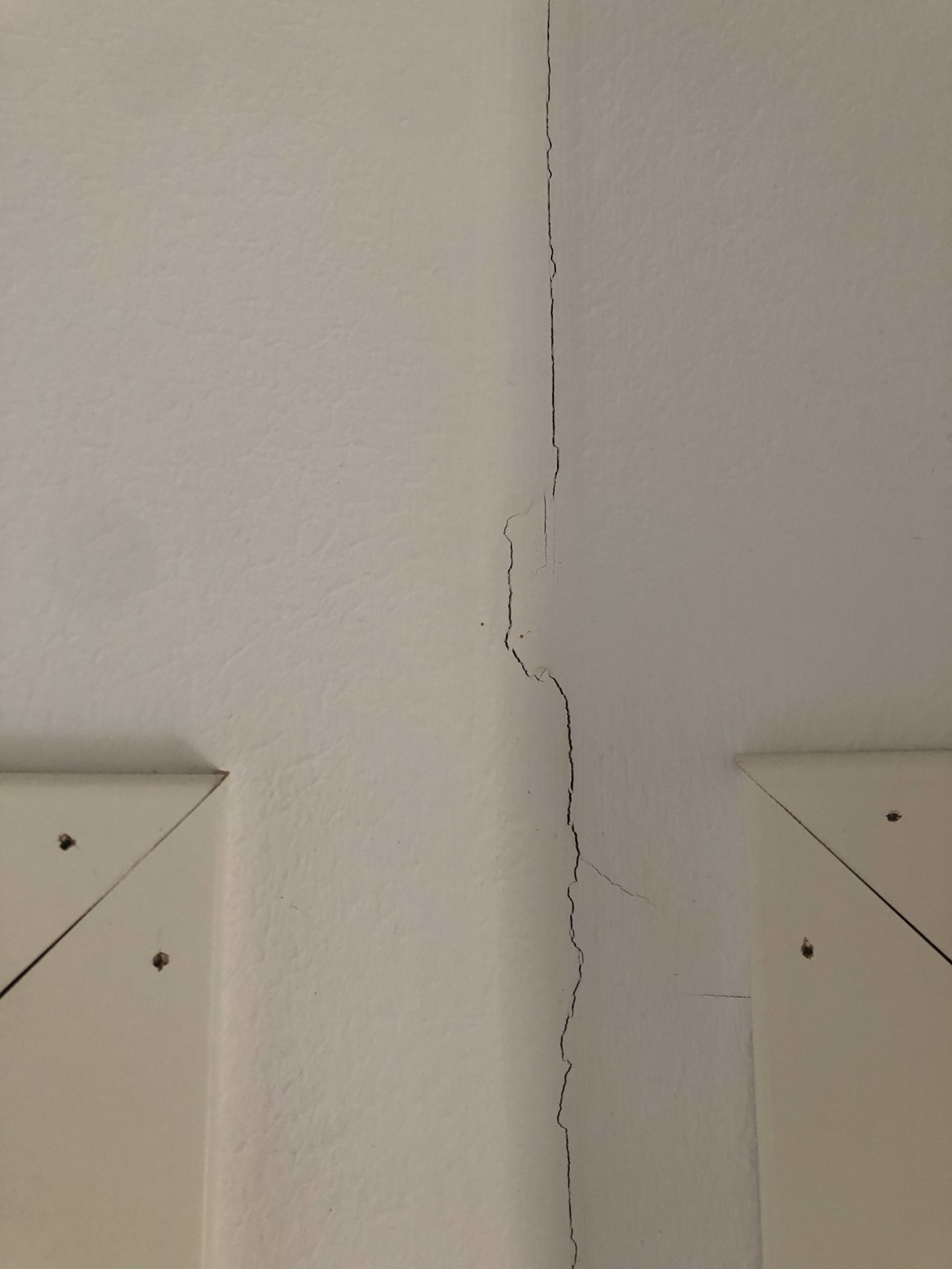 Hej, Vi har en innerdörr som kärvar och tar emot lite i övre hörnet när vi ska öppna och stänga den. Runt ena hörnat är denna spricka, är det en sättningsskada? Hur ska vi gå vidare? Dörren är placerad i mitten av ovanvåningen på vårt tvåvåningshus i trä från 2010.