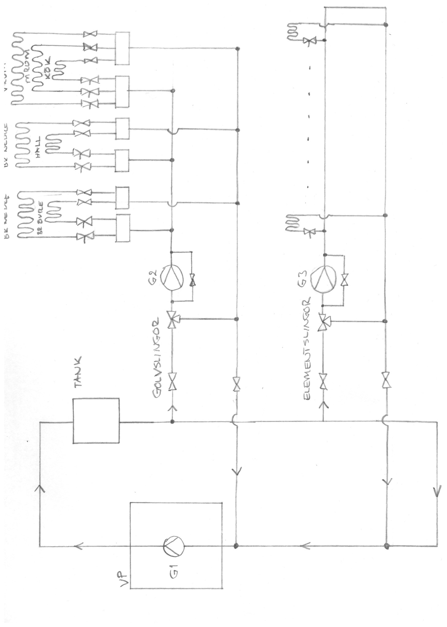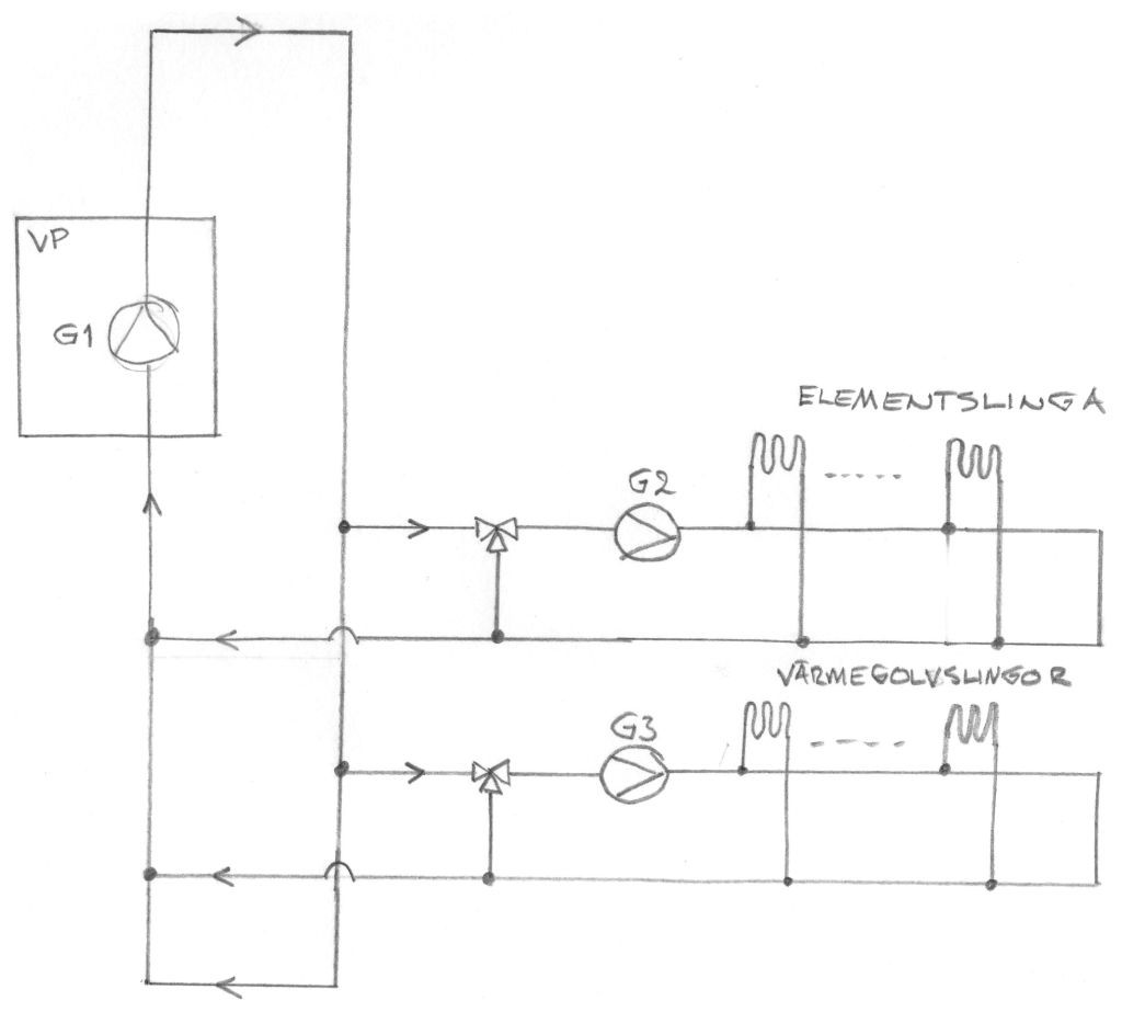 VP vill gärna att minst en radiator är fullt öppen, annars kan den stanna. I princip kommer ditt schema att funka. Jag skulle k0omplettera med en avstängbar bypass runt G2 och G3 så att du kan förbikoppla dom om det behövs.