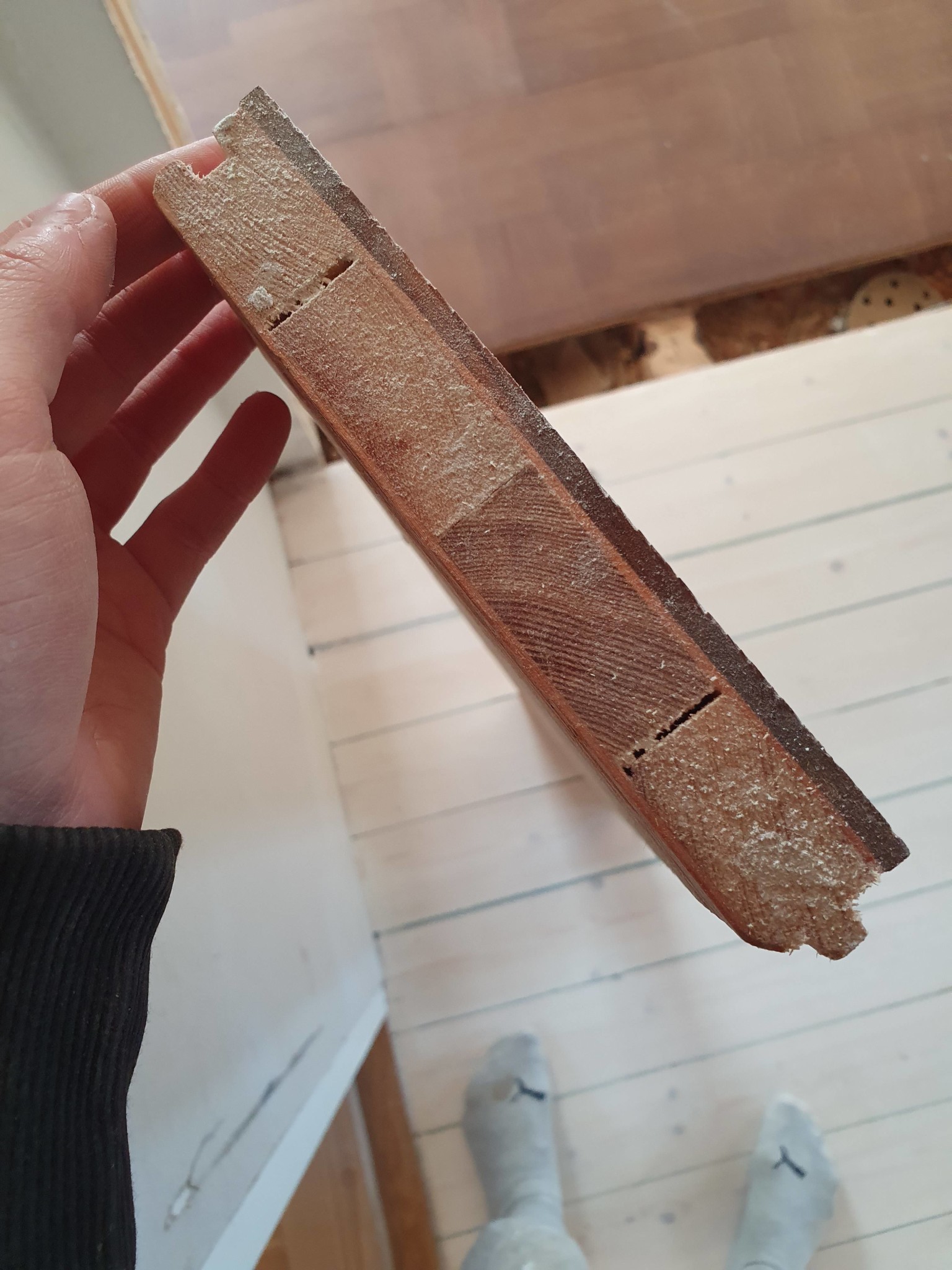 Bifogar bild på en bräda som jag hittade på vinden som inte är slipad så den är lite tjockare än 25mm. Men då kan man se hur golvet är uppbyggt samt en närbild på golvet som ligger taget från sidan där tröskeln saknas och en övergripande bild.