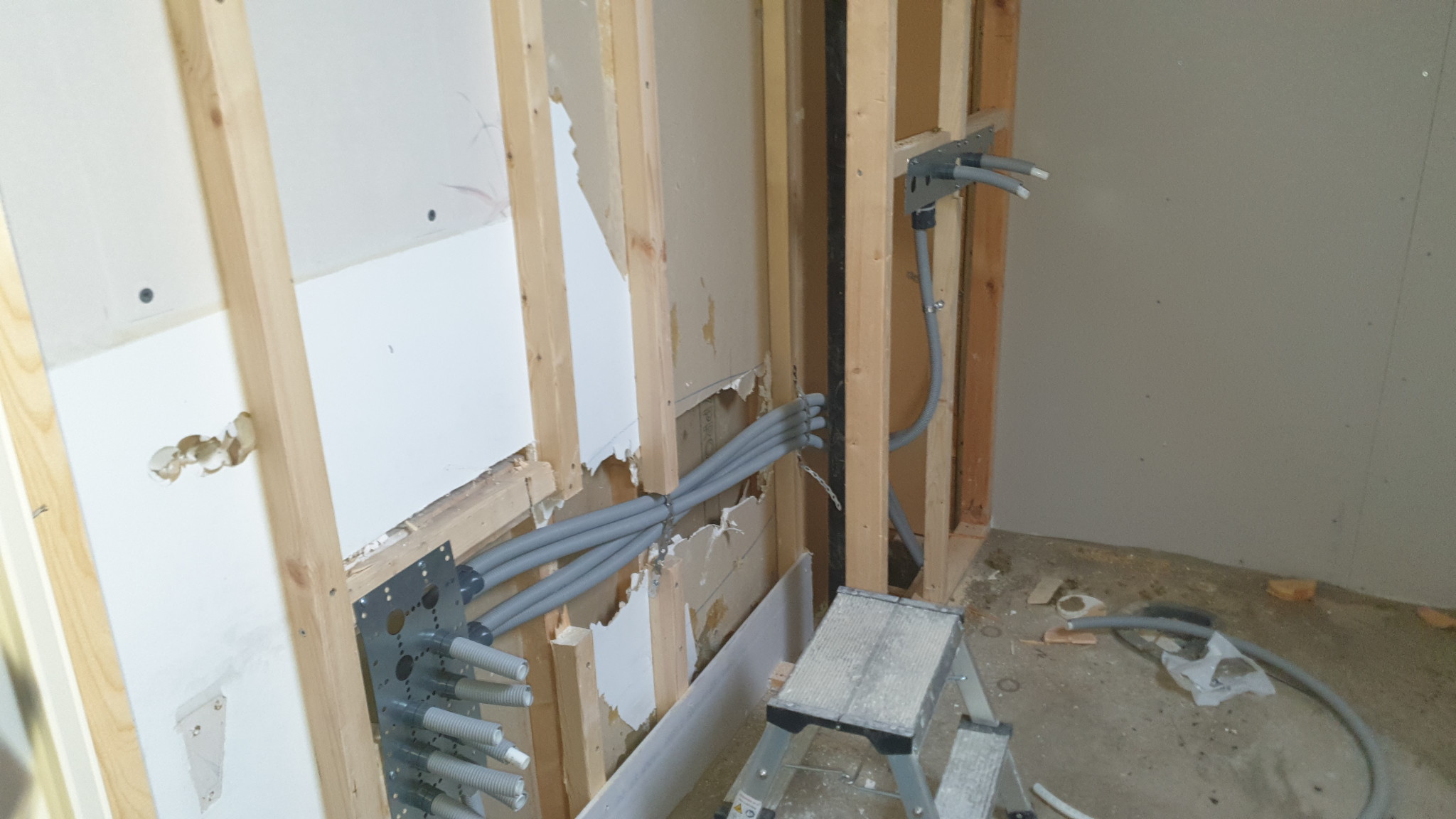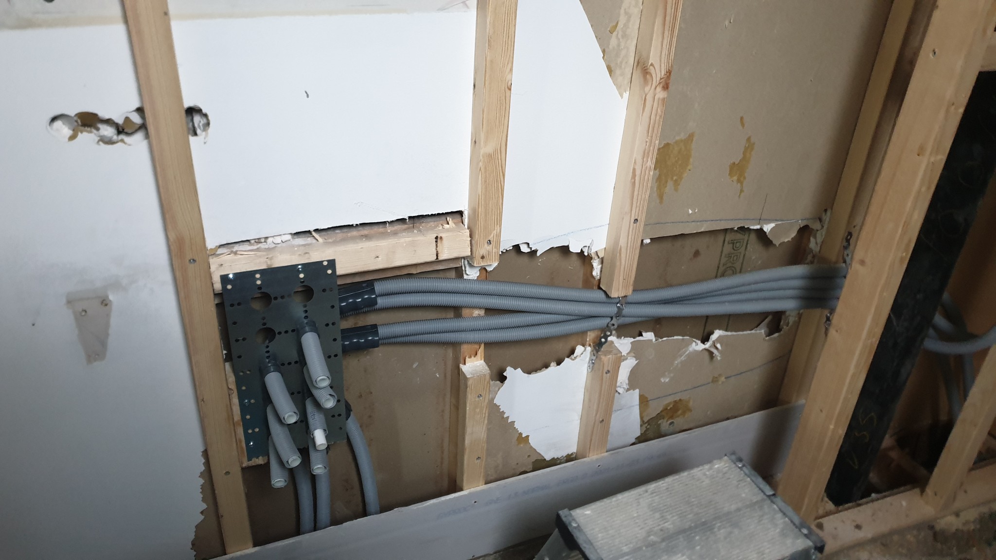 - Mellan skyddsrör och tätskikt ska det vara min 60 mm. På bild 3 är ett rör intill vägg. Där ser ut att vara mer än 60 mm nu men oklart om tätskiktet ska sättas på skivan man ser eller om det ska reglas ut.