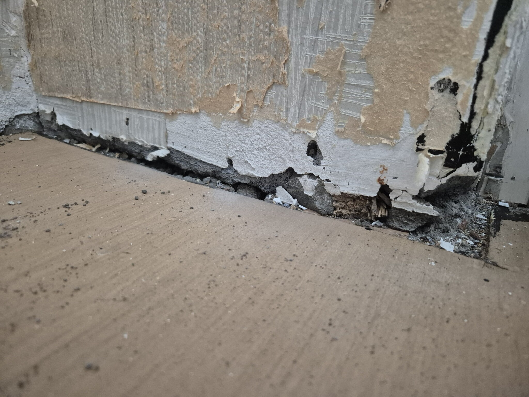 Eftersom det är föreningen som äger väggarna så skulle jag meddela styrelsen att det är sprickor i bärande väggar och att det lossnar material längs med golvet och fråga vad lämpliga åtgärder är från föreningen sida.