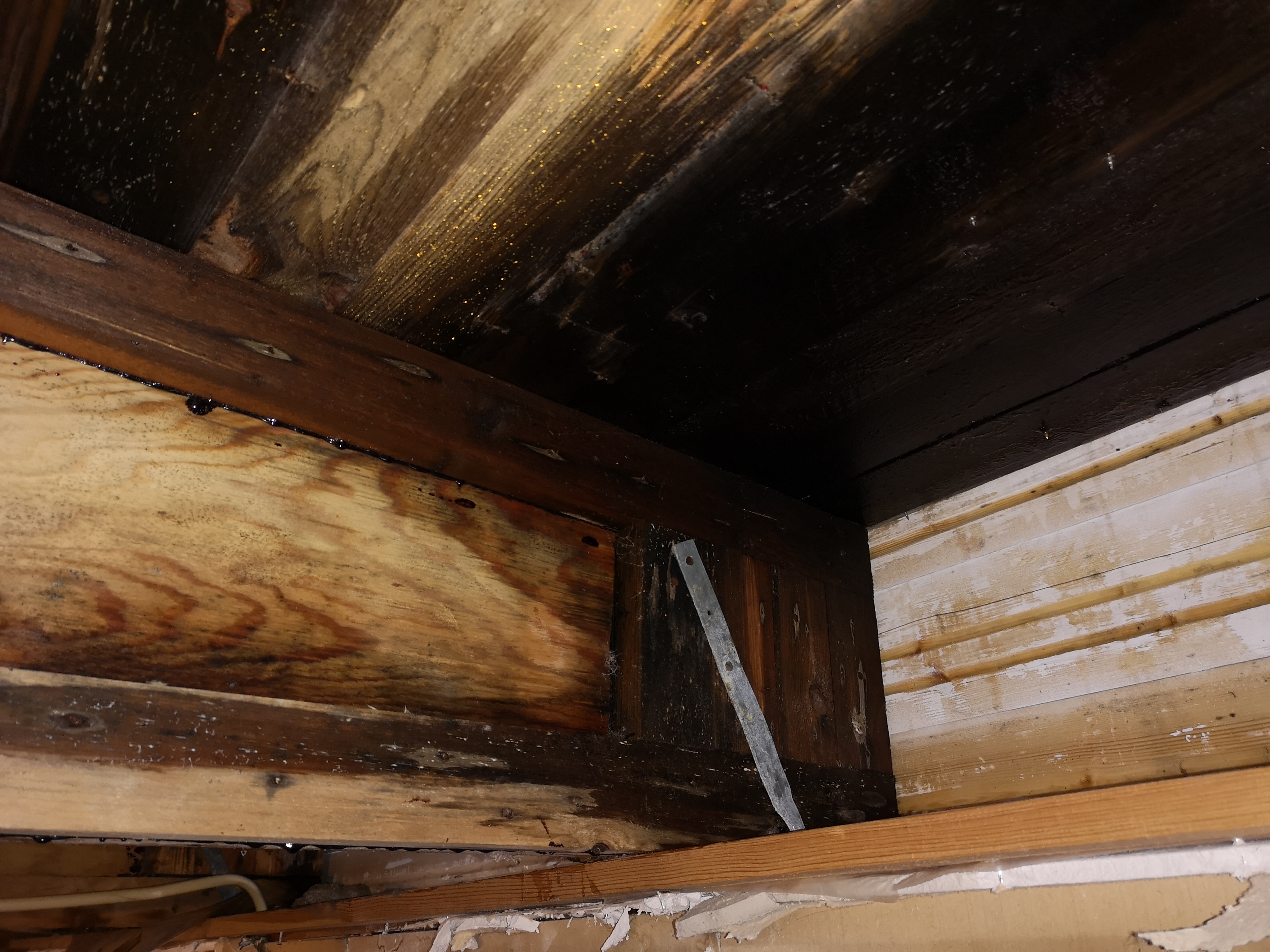 Det droppade från garageinnertaket i morse och när jag tog ner gipset i innertaket låg det en ansenlig mängd vatten på plasten. Efter att ha tagit ner plast och isolering ser det ut enligt bild ut mot kanten dit taket sluttar.