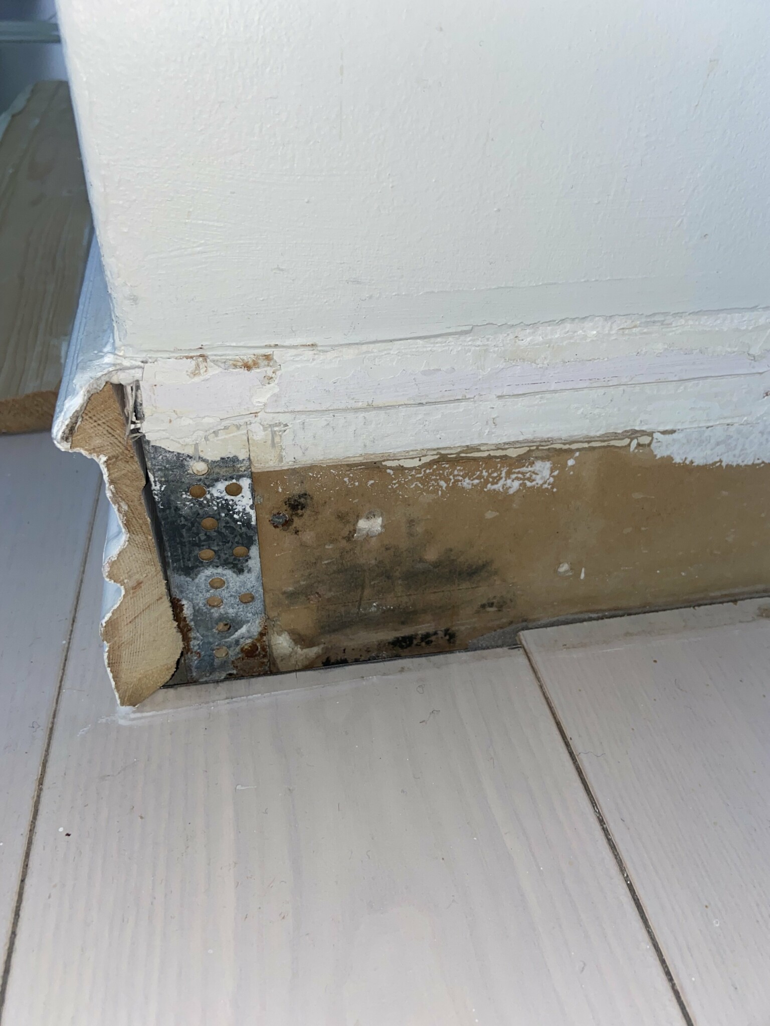 Fick syn på detta när jag tog loss en golvlist. Är det någon som kan avgöra om det är svartmögel? Bilderna är tagna i köket på väggen som ligger intill badrummet, och det är just i detta hörn som duschen är. Sista bilden är på listen som jag tog loss. Noterade även rost på spikarna/metallen. Vet att det tidigare varit en fuktskada här pga badrummet som då fick renoveras och golvet i köket byttes ut. Men detta ska alltså vara åtgärdat enl. förra ägaren, ca 10 år sedan. Vad bör man göra? (Bor i bostadsrätt)
