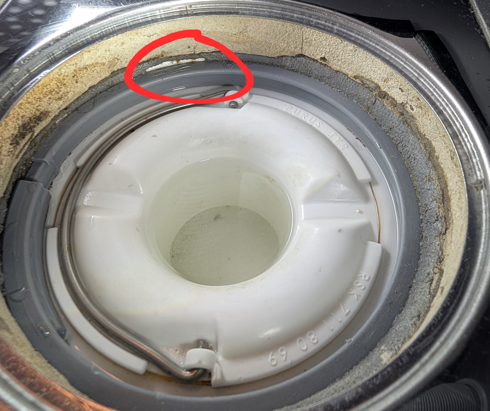 Jag har en fråga om en tre år gammal golvbrunn. På bilden har jag markerat ett område i rött. Till höger om det ser jag tydligt tätskiktet, som känns lite mjukt och har små gropar. Det markerade området känns däremot styvt och är vitt (borde vara smutsigare efter tre år?), vilket får mig att tro att det kanske är plast från brunnen istället för tätskikt.