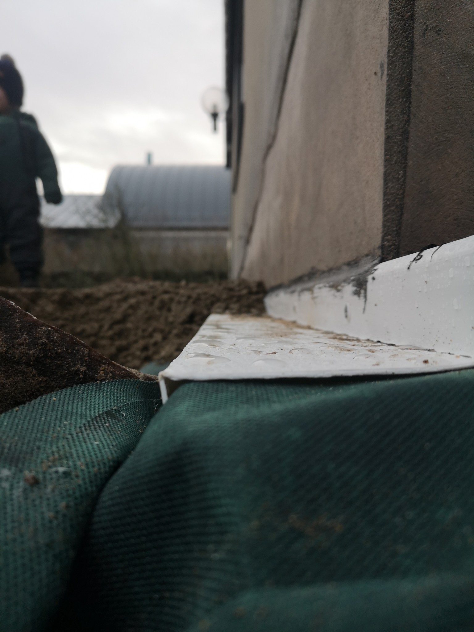 2. Den överliggande plastskyddet på isodränen saknade lutning bort från huset på vissa ställen. Den är som pressade uppåt och lutningen blir in mot huset istället. Så när det regna häromdagen så rann vattnet i av utan vatten samlades på kanten istället för att rinna av. Spelar det någon roll? Vad är standard?