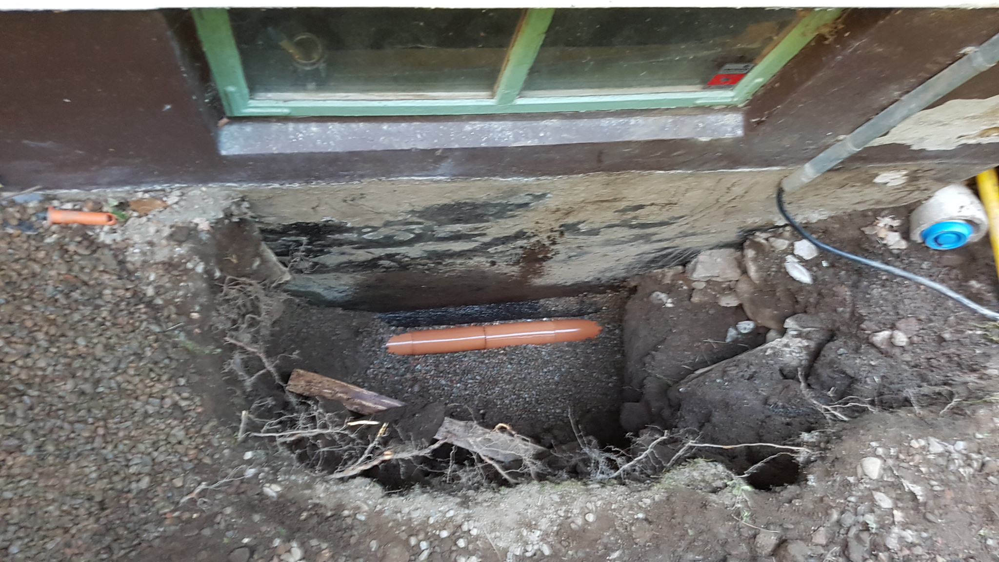 Bilden är nog lite missvisande. Det sitter kallasfalt på väggen, men den torkade jorden utanpå får det att se ut som att det inte gör det. Att det ser blött ut beror på att jag hade spolat av tegelrören före jag tog bilderna.