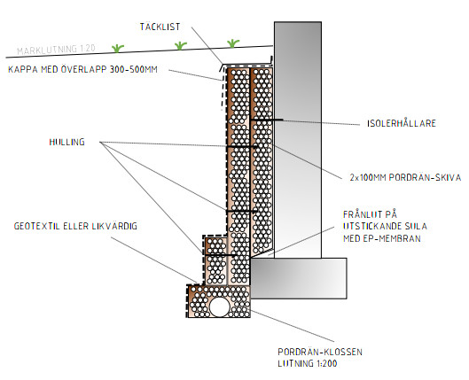 Med Pordrän så får du ett kapilärbrytande sikt mot väggen via deras skiva som för ned fukt till rören. Ovanför skivan finns en helt tät kappa som gör att vatten inte följer väggen nedåt.