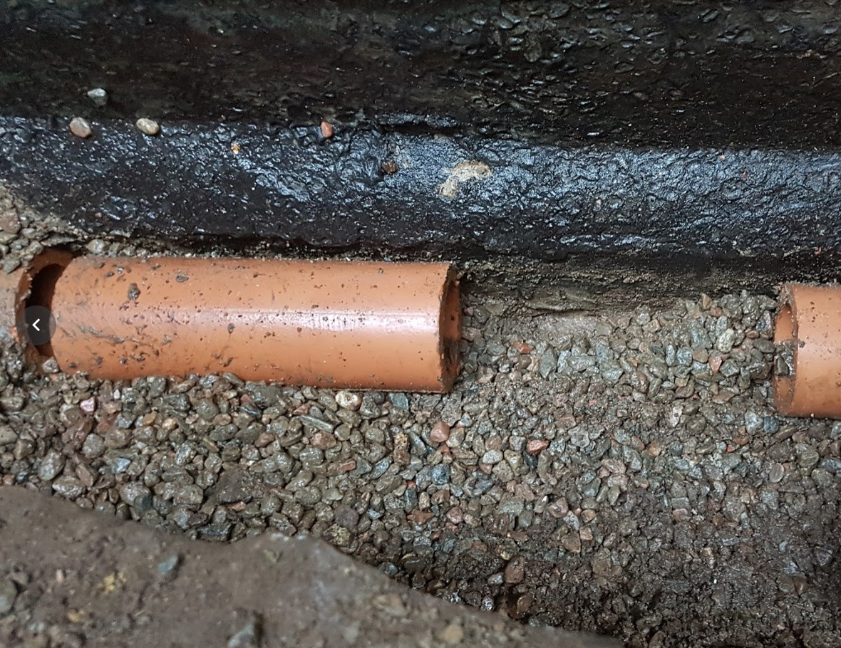 Dräneringsrör i tegel under källargolvet
