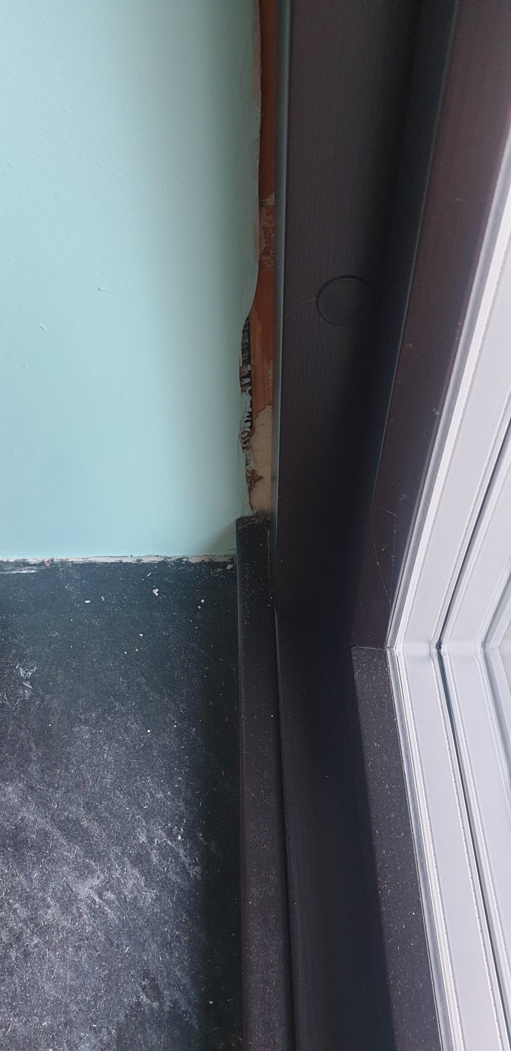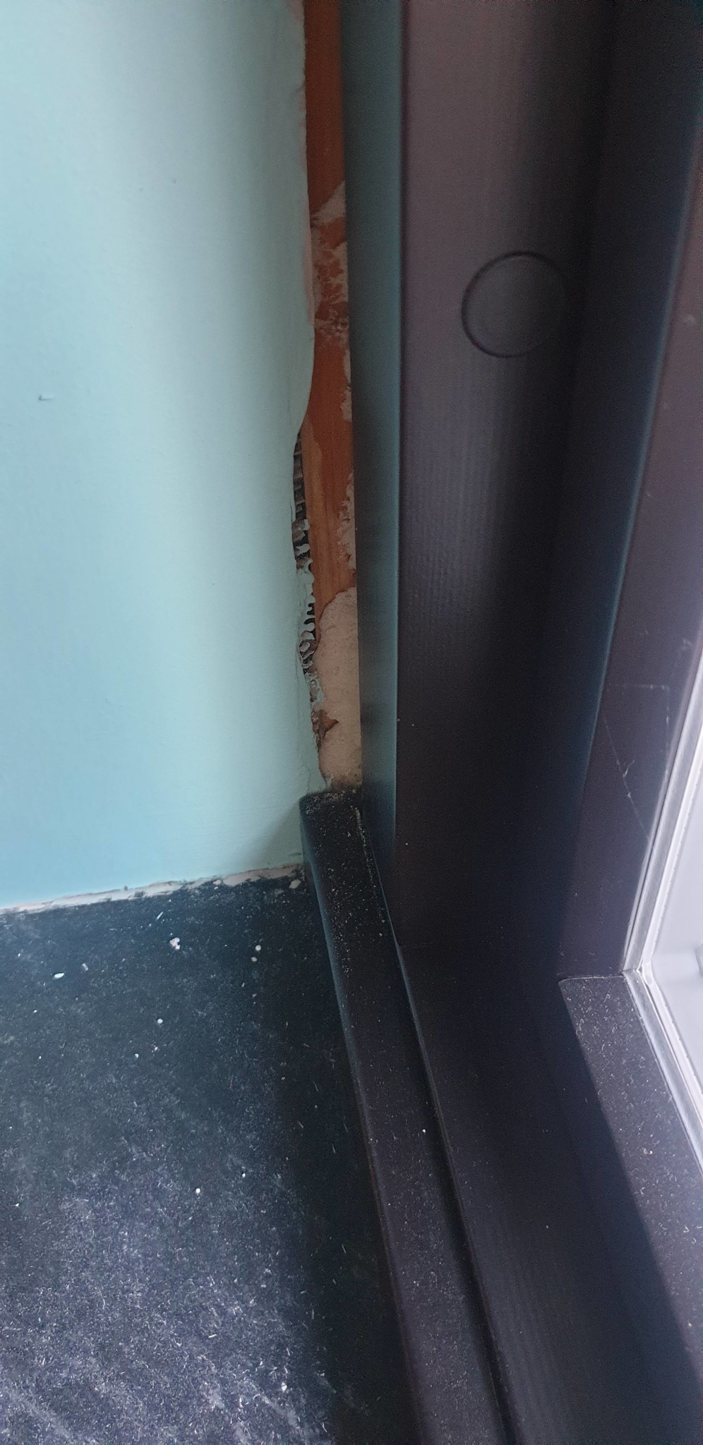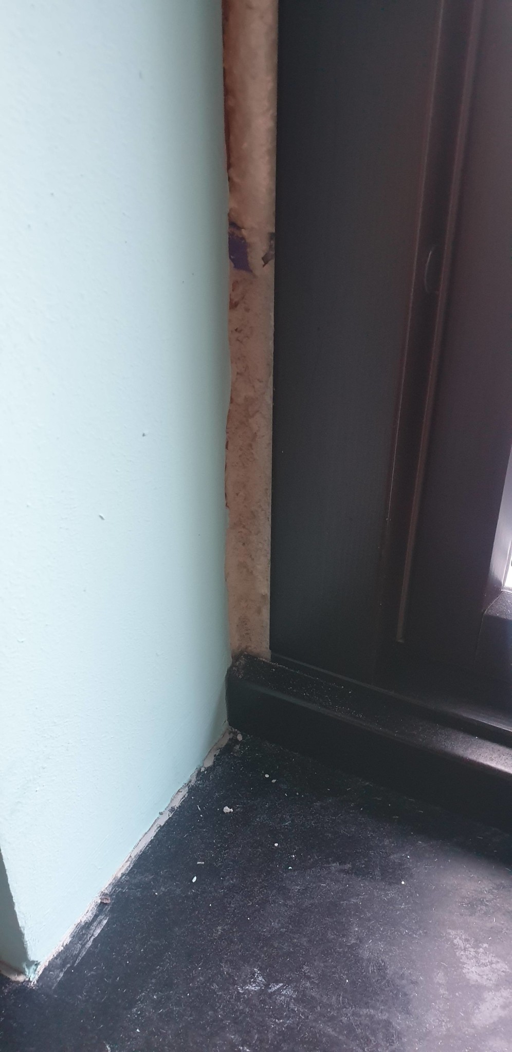 De tog bort lite spackel för att kunna komma åt bättre och täppte sedan och förseglade helt runt om samt satte till sist tillbaks listerna.