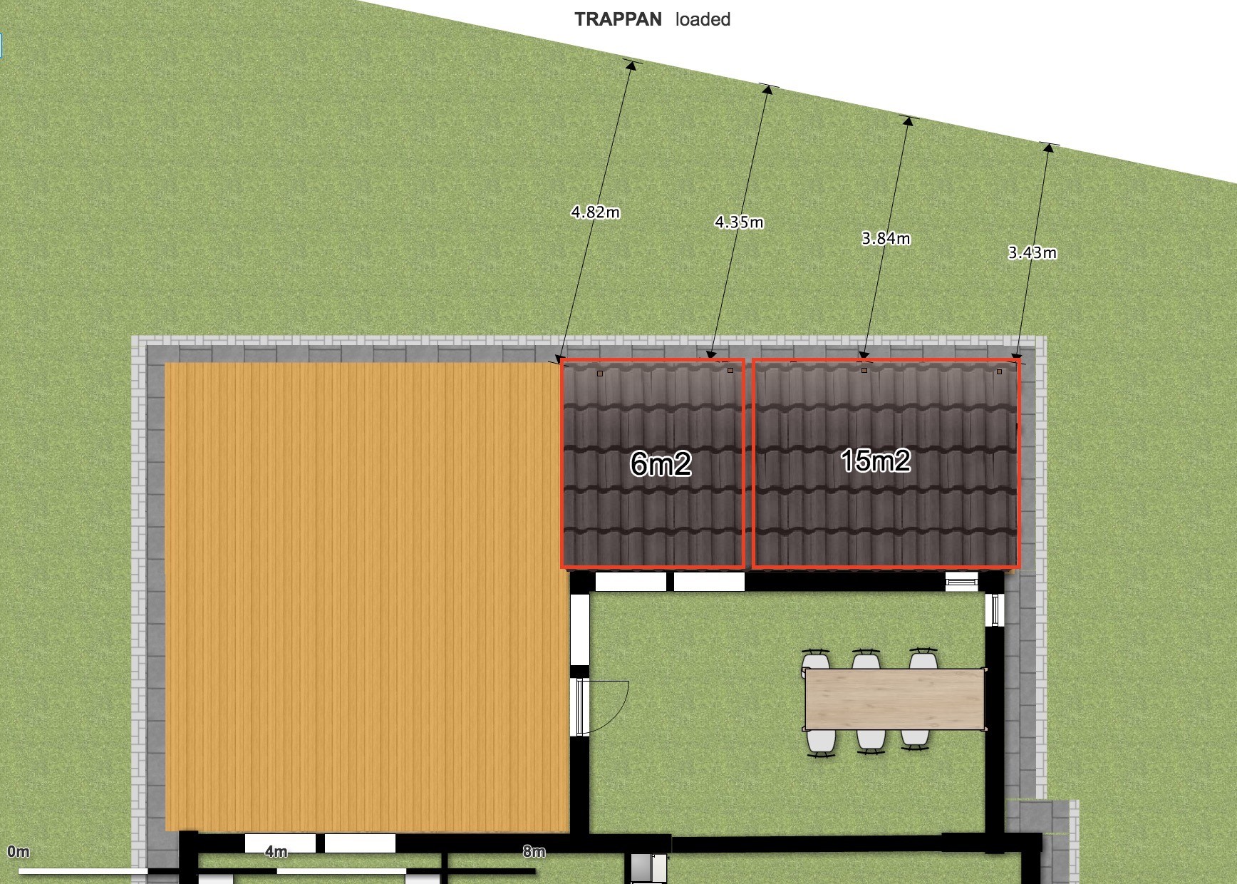 Problemet för oss är att avståndet från altantakets ena änden till granntomt skulle bli 3,43m (se bild) och gradvis upp till 4,80m i andra änden, eftersom tomtgränsen inte är vinkelrät med altantaket.