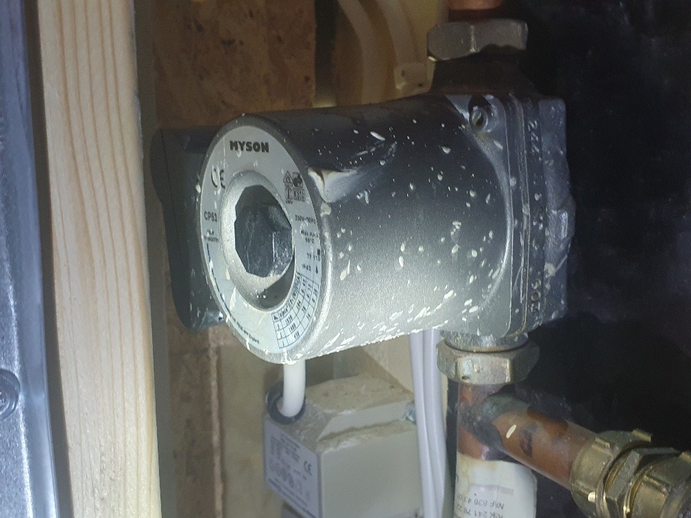 Cirkulationspumpen till golvvärmeslingorna är jättevarm, ca 55°C. Modell Myson CP53, ca 20 år gammal. Vattnet som den ska cirkulera är runt 27°C. Tyst som en mus och slår jag av strömmen till den svalnar den. Är den månne trasig?
