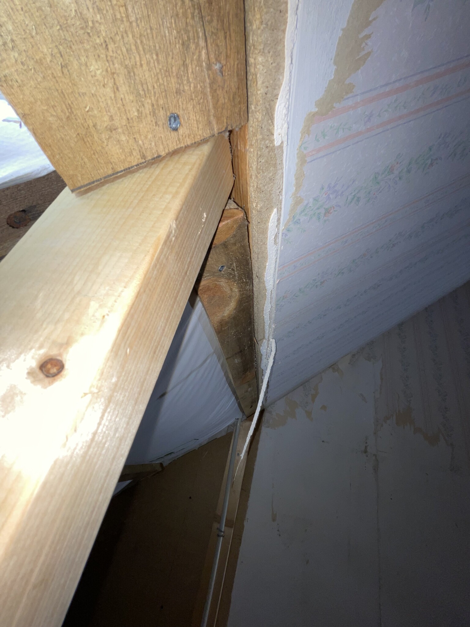 Det nya ser alldeles för rappligt ut samt att du saknar stående under en av takstolarna vilket tyder på detta men vad vet jag, kanske är det ett taskigt försök att räta upp ett bångnande tak....