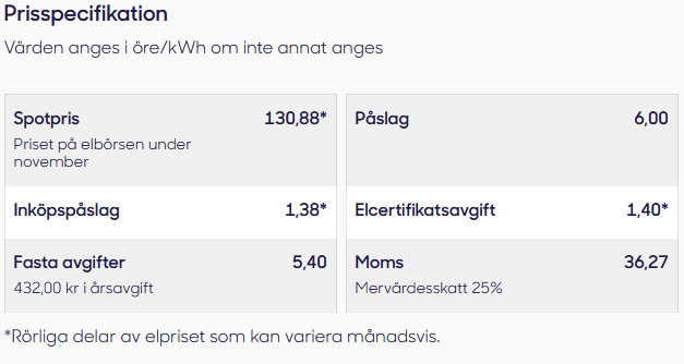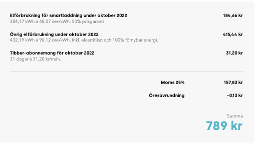 Om man då jämför med Vattenfall står det spotpåslag 6 öre och elcertifikat 1,4 öre, exklusive moms (på min räkning) Vilket i så fall skulle vara bättre. För det kan väl inte finnas andra påslag som inte redovisas på fakturan. Hur ser Tibbers faktura ut?