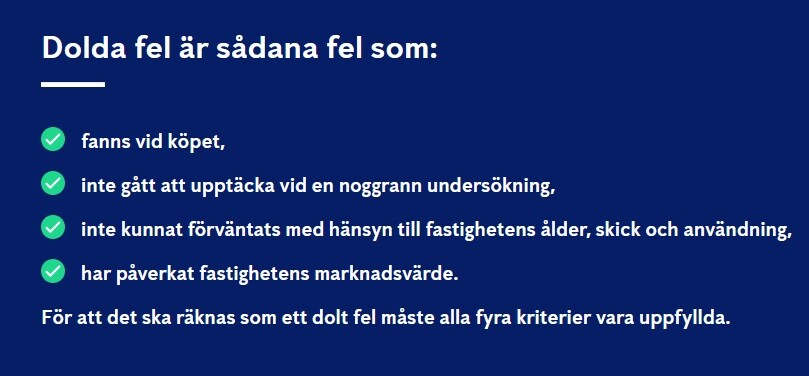 Vid en korrekt kontroll av ventilationen hade felet säkerligen upptäckts. Då är det inte ett fel som kan ge ersättning, kallas ibland dolt fel. Om ventilationssystemet ingick i besiktningen så borde det noterats i besiktningen, men i många besiktningar ingår inte ventilation. Vad som ingår och inte ingår beskrivs i protokollet. Men även om det mot förmodan skulle vara ett fel som kan ge ersättning så faller det på nivån, praxis är att avvisa krav på så låg nivå att de inte skulle påverkat försäljningspriset.B bearcave skrev:Material + arbete har jag fått två offerter på och väntar på en tredje. Ena var på 12k fast pris, andra runt 25k fast pris. Inte summor jag gärna tar om jag inte behöver det.