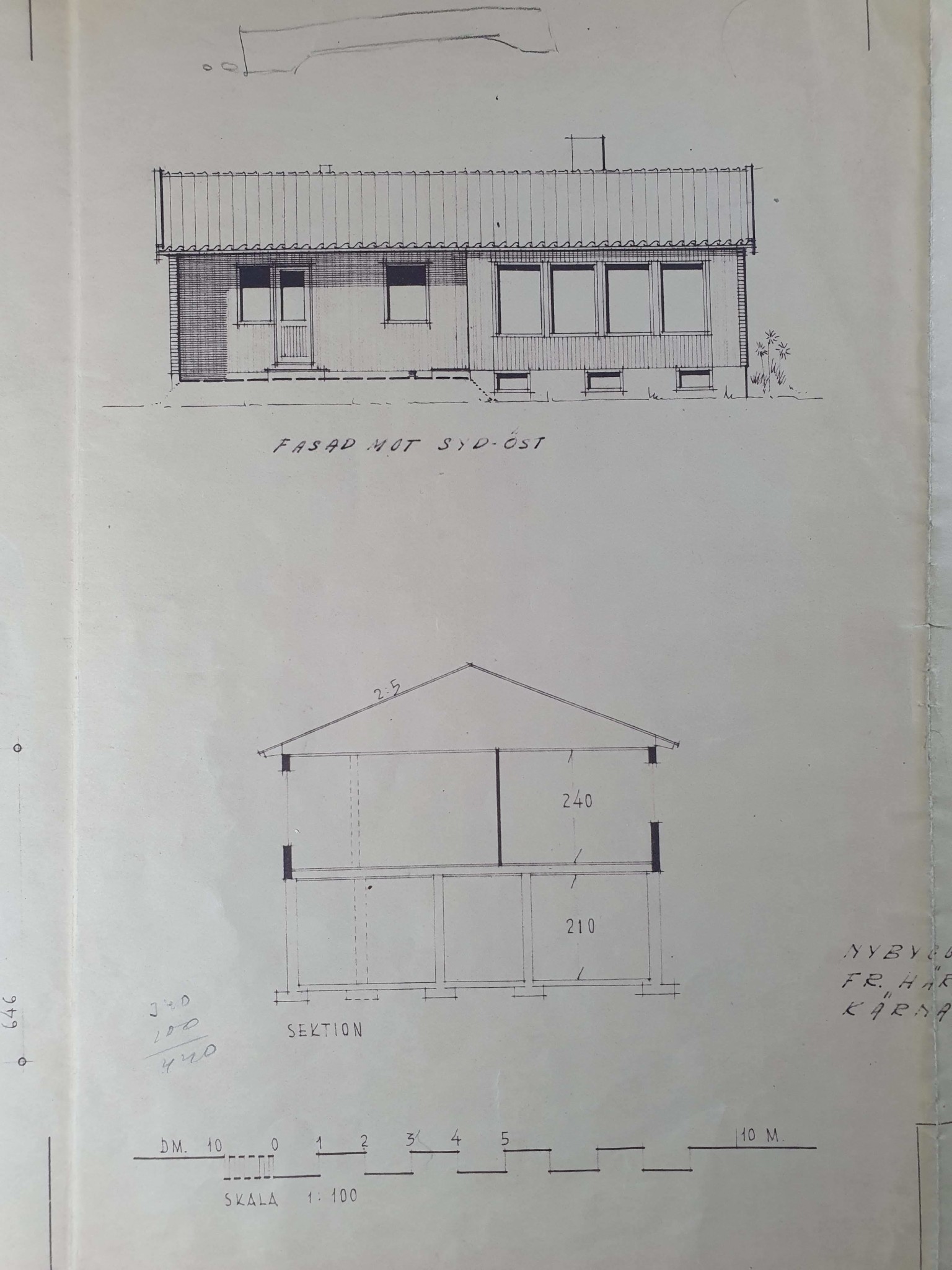 Arkitektritningar av ett enplanshus med källare, inklusive fasadvy mot syd-öst och sektionsritning med dimensioner.