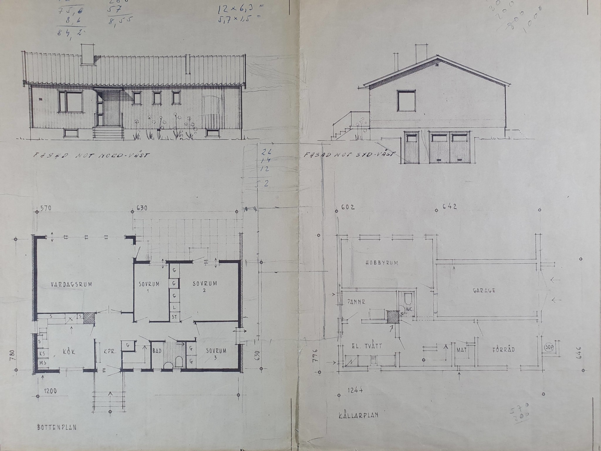 Arkitektritningar av enplanshus med källare inkluderar bottenvåning, källarplan och fasader.