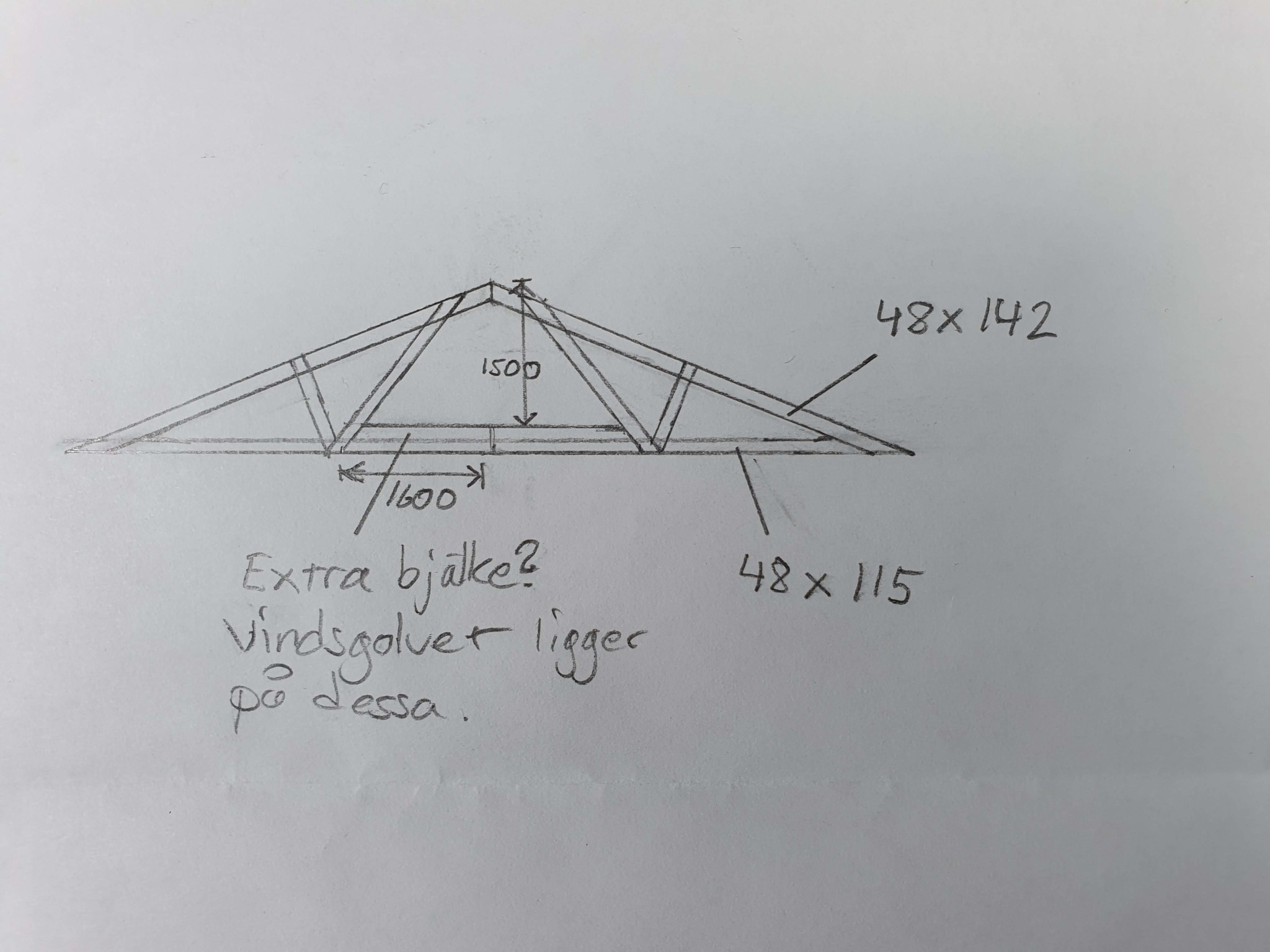 Handritad skiss av takstol med måttangivelser och frågetecken vid extra bjälke.