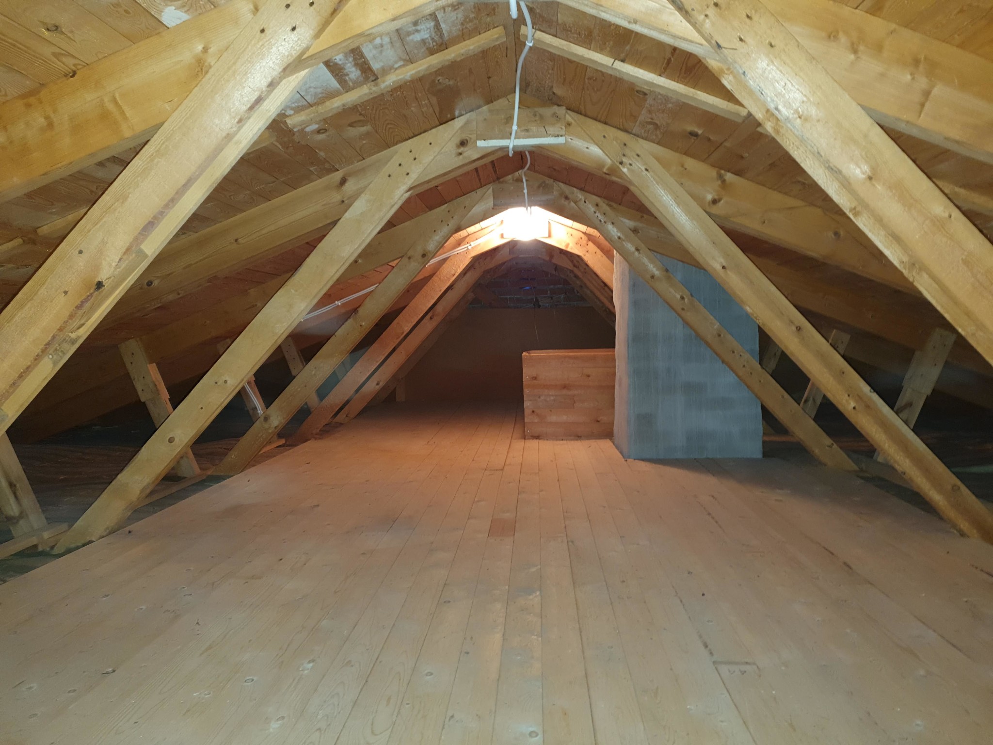 Inredningen på ett vindsvåning med synliga takbjälkar och trägolv, samt en delvis blockerande vägg.