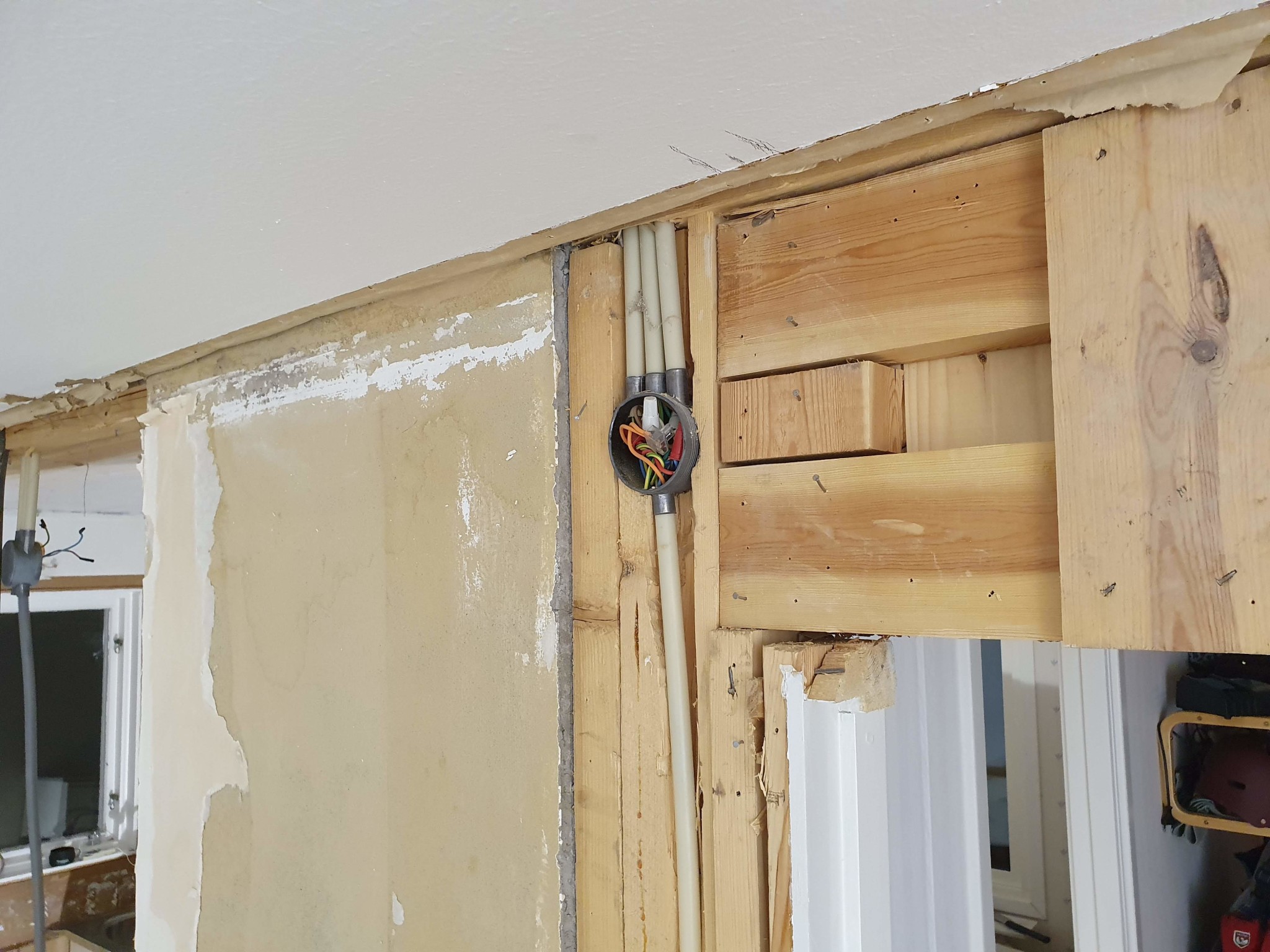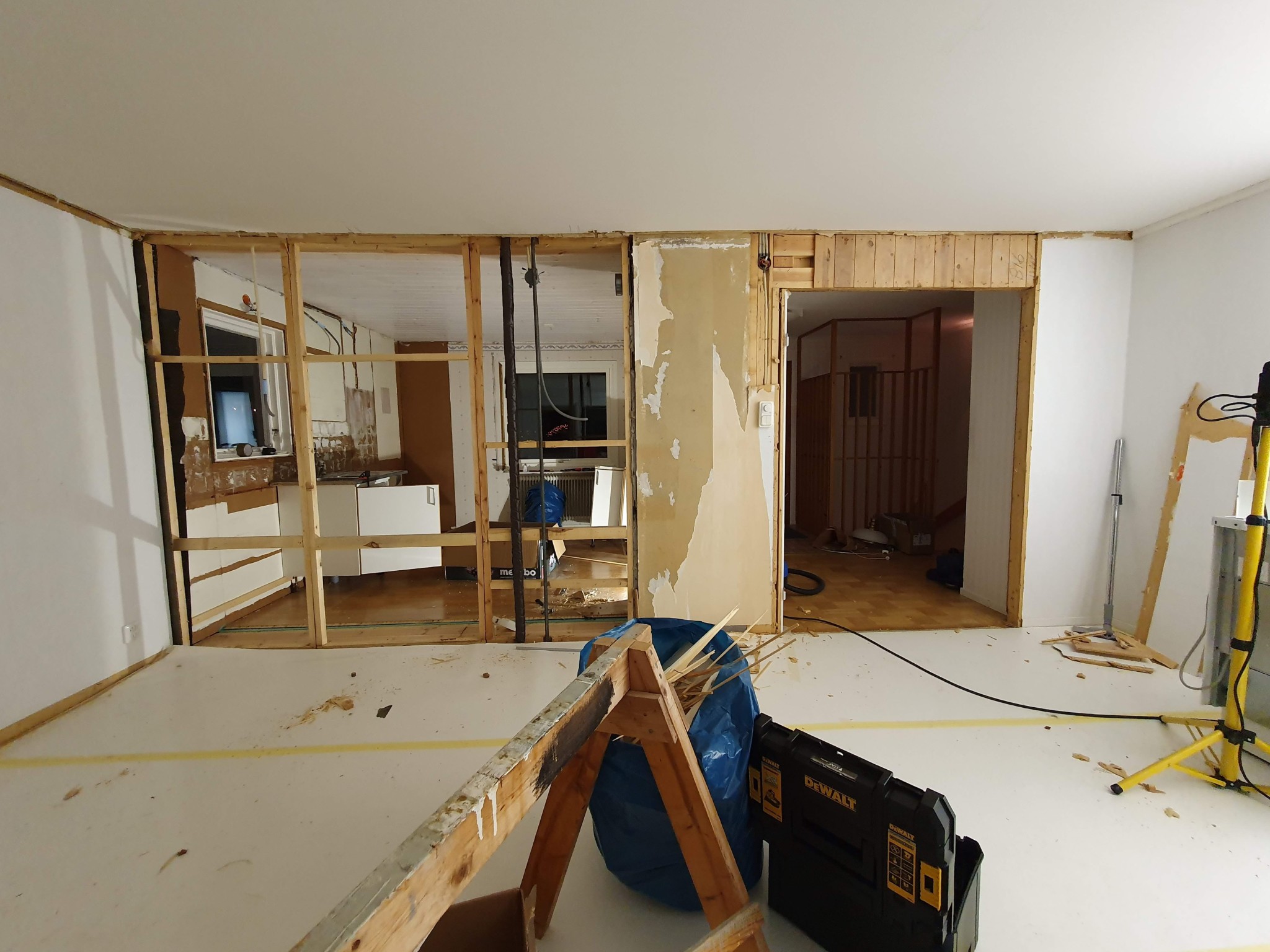 Renoveringsarbete där vägg mellan kök och vardagsrum delvis har tagits bort, med synlig trästomme och verktyg.