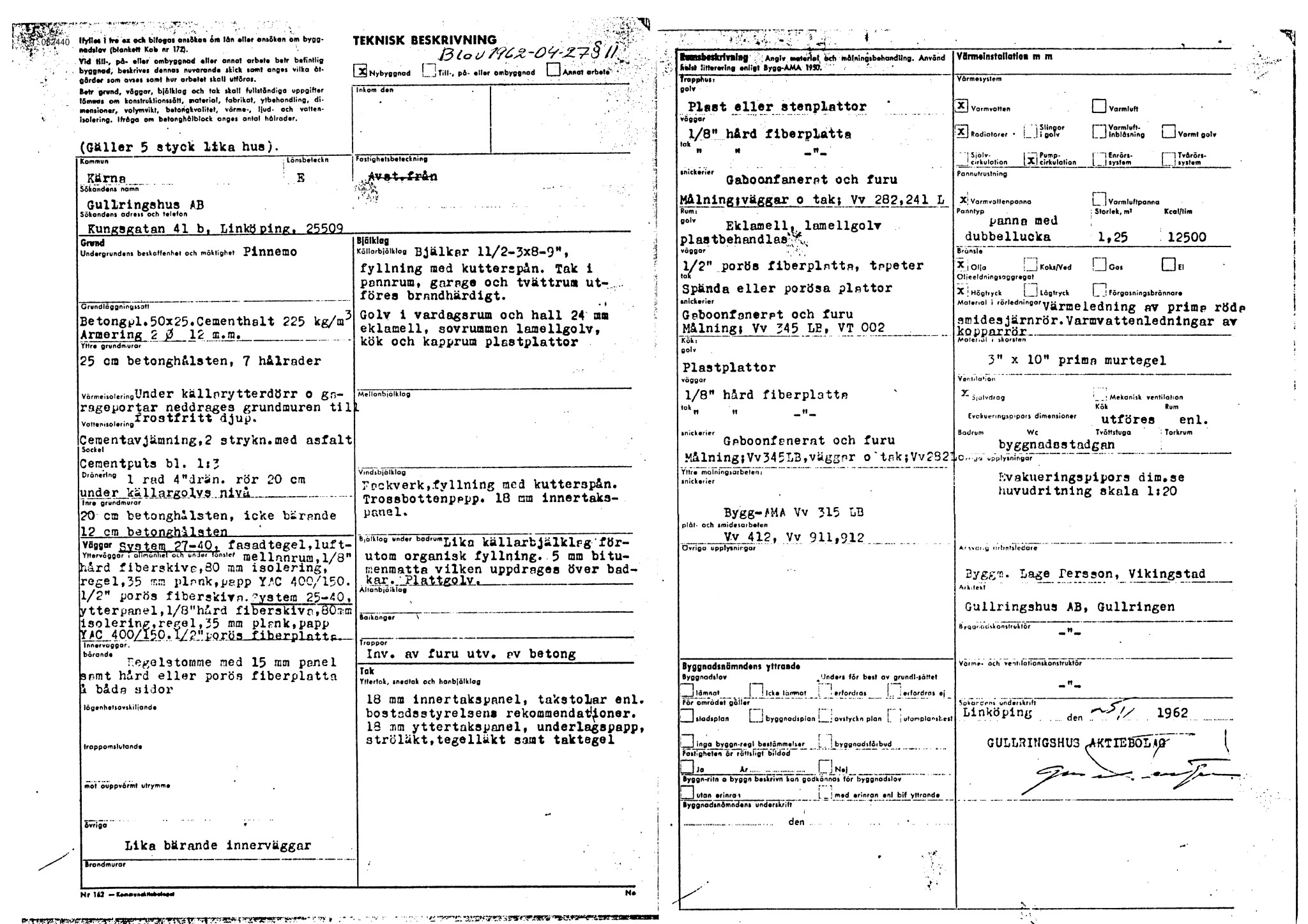 Svartvit bild på teknisk beskrivning och sektionsritning för byggprojekt från 1962.