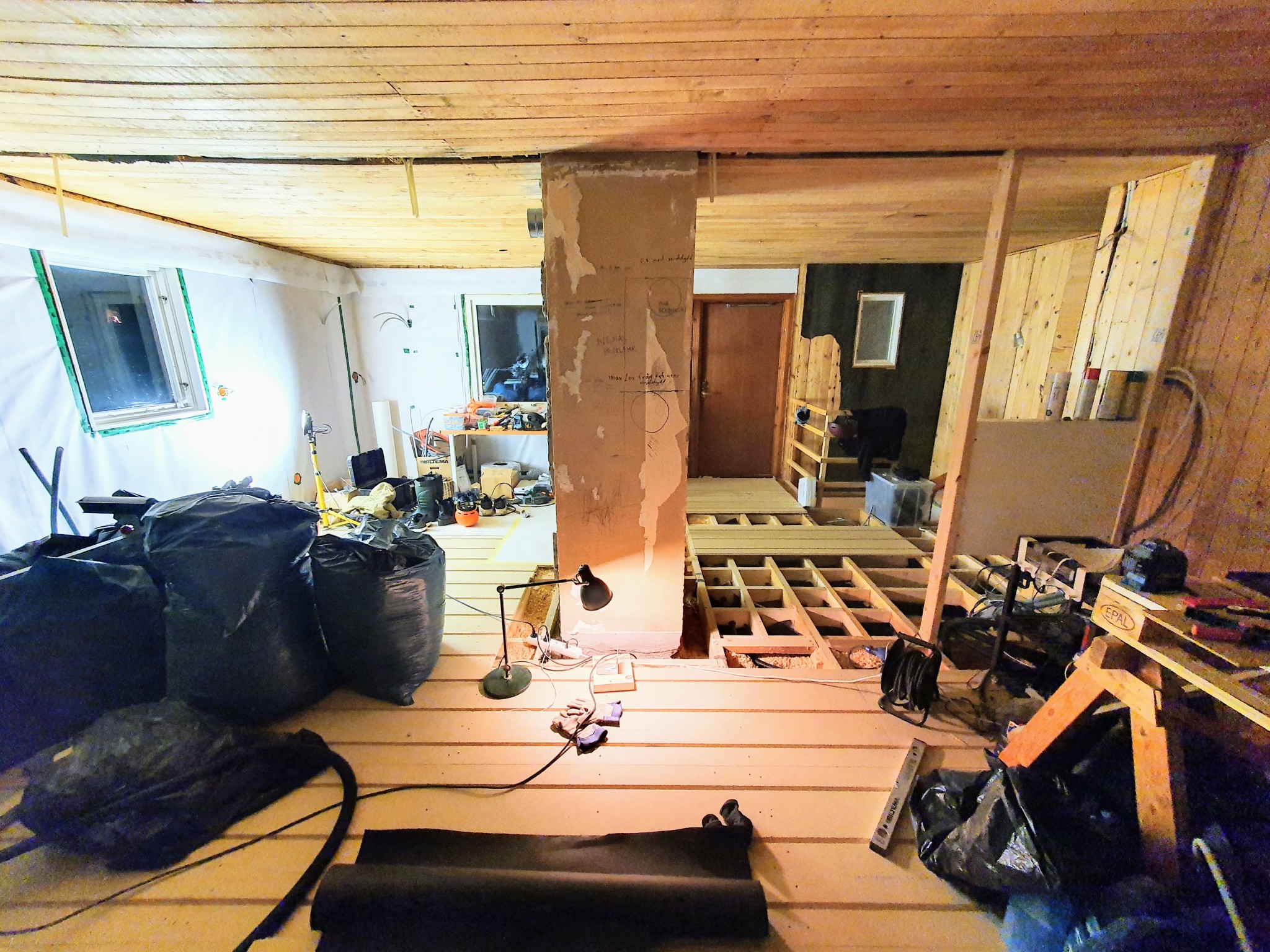 Vi tog ner den sista biten vägg mot sovrummet för att bygga upp den igen med ett fördelarskåp för golvvärme inuti. Väggsnutten på samma sida men mot murstocken låter vi vara borta.