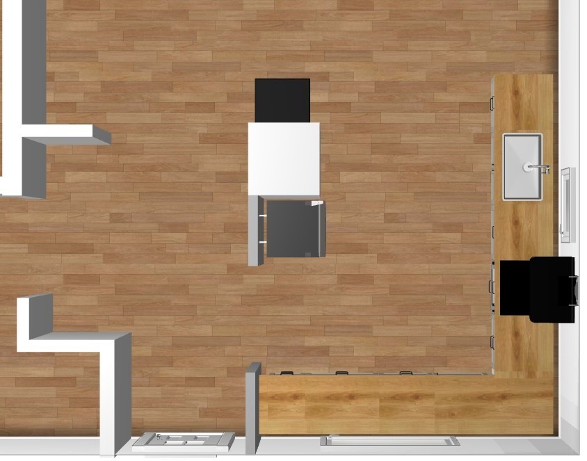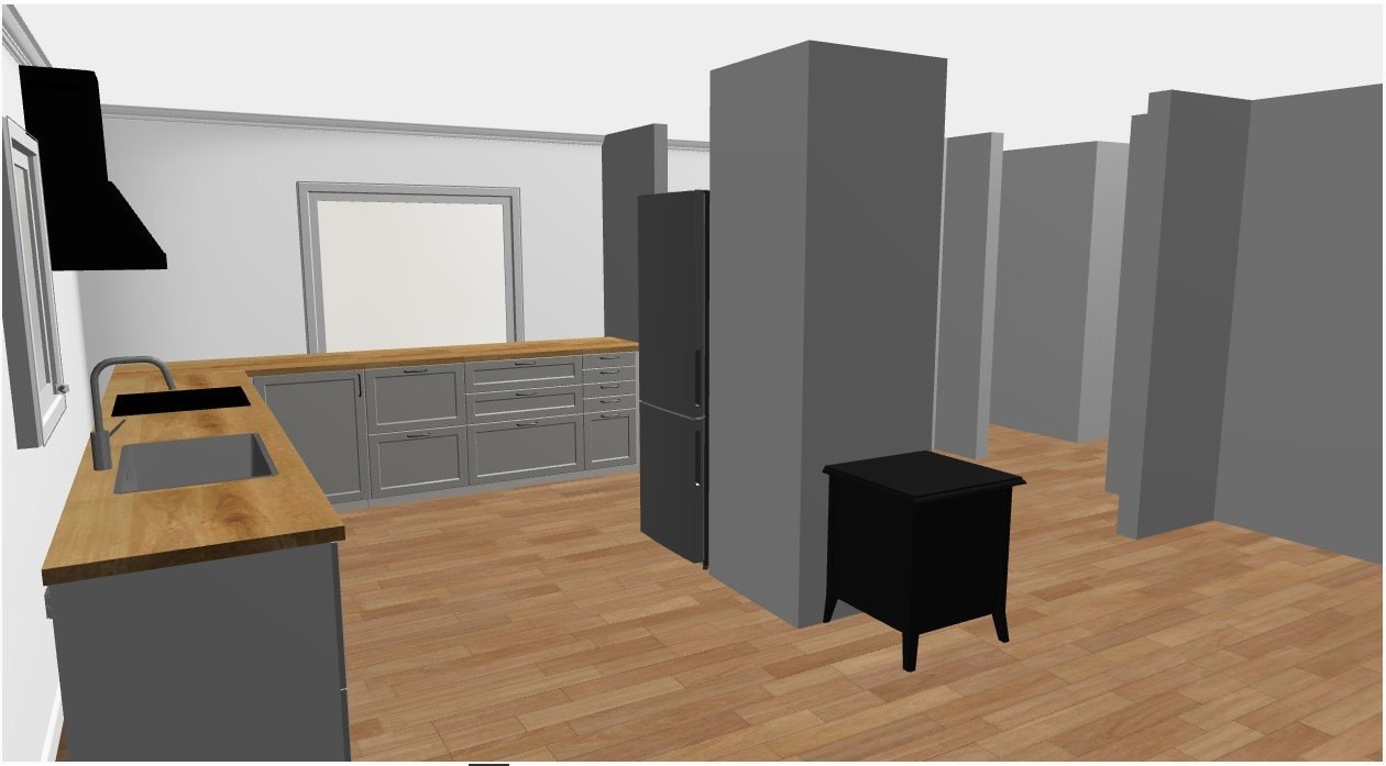 3D-modell av ett kök utan överskåp, med djup bänkskiva, stor kyl/frys och svart kamin.