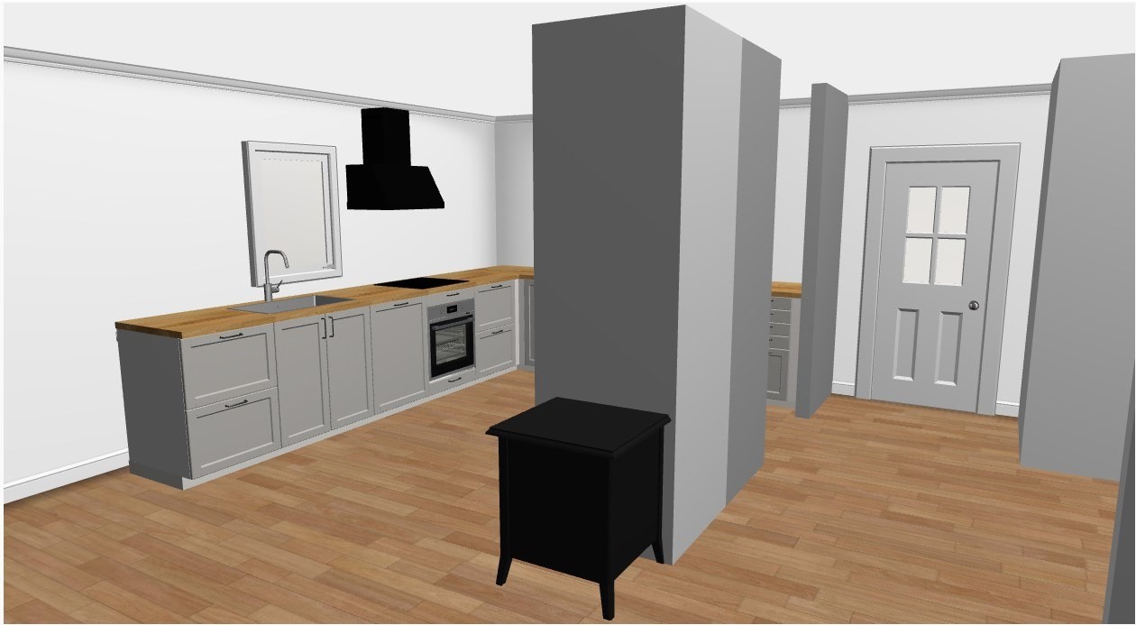 Vi har tänkt oss ett kök utan överskåp med 70 cm djup bänkskiva. Troligen bygger vi ut en ikeastomme 10 cm från väggen. Väggen bakom kylen är bredare än på bilderna, ca 96 cm, för att få in en 70 cm ellet helst något bredare kyl/frys. Hade gärna fått in en 90 bred men det blir för stort. Spisfläkten tänkte vi dra ut genom väggen.