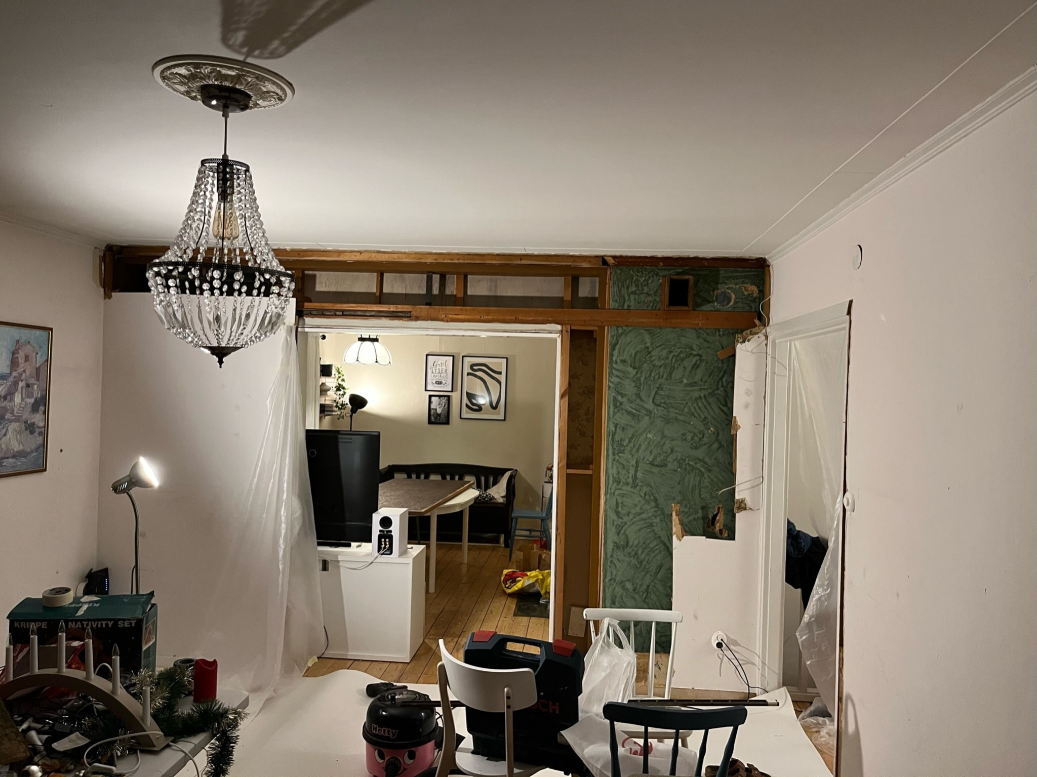 Det ser ut att vara ett hus från Stockholms stads småstugobyrå. Byggnadsår 1936 borde för dessa hus innebära regelstomme, inte plank, och då bör väggen inte vara bärande. Vet du om du har regelväggar eller plankväggar? Har du kollat med Stadsbyggnadskontoret om de har fler ritningar?