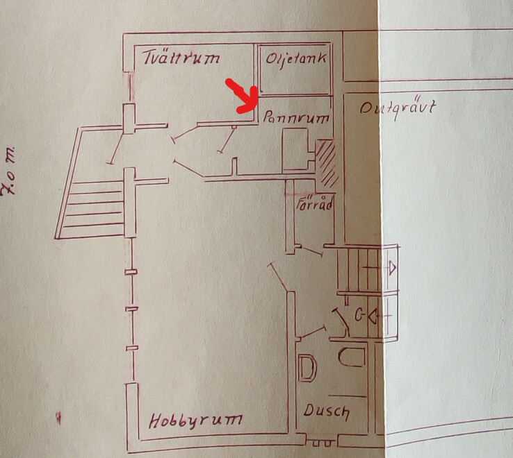 Väggen i källaren som ska bort markeras med röd pil, ritningen stämmer inte riktigt då vägg/dörr fortsätter ned till väggen mot hobbyrum. Korridor mellan tvättrum/hobbyrum finns ej.