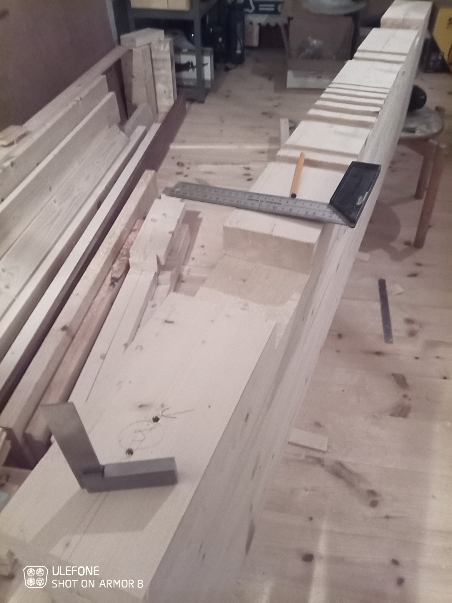 Nu är alla delar klara att klubbas ihop, men jag väntar med limning tills jag lyckats låna ett gäng tvingar som klarar bredden. Det blir en rätt tung pjäs, förhoppningsvis stadig men ändå hanterbar. Jag tippar på 90-100 kg...