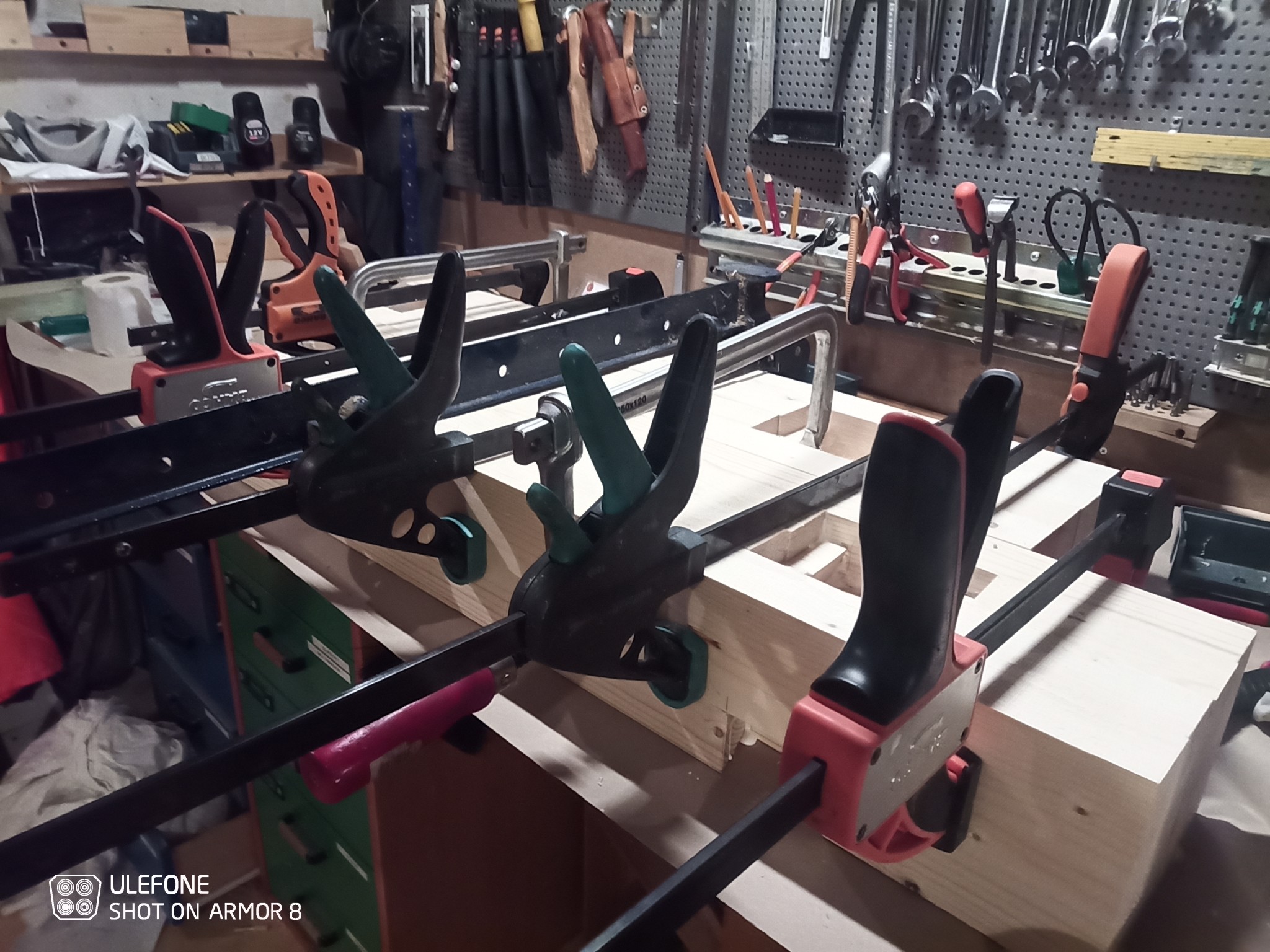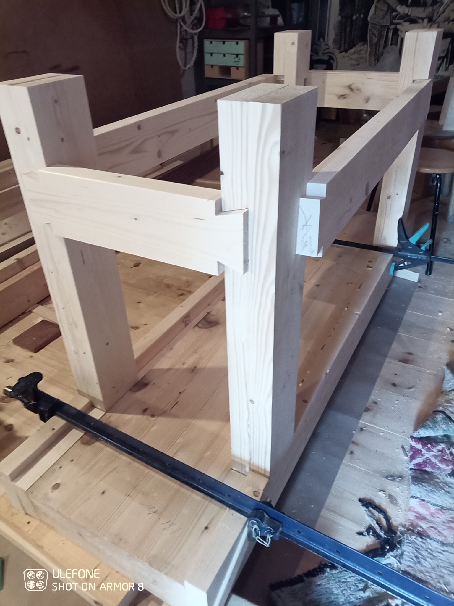 Hej igen, ett par bilder... Skivan är 11.5 cm tjock och blir 53 cm djup. Bilden med tvingarna är från idag när jag limmade ihop benen. /fox