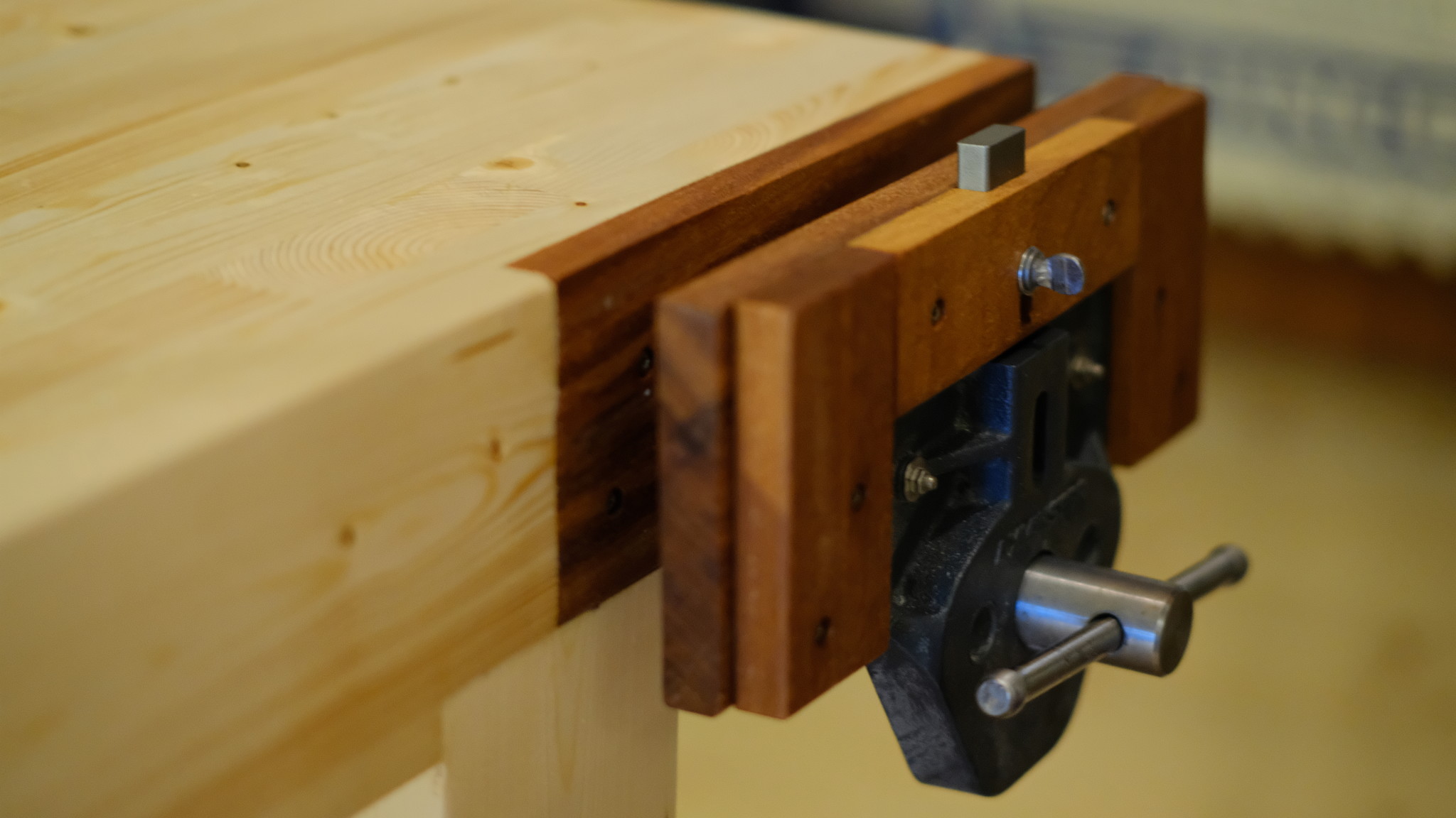 Hej! Tänkte bygga ihop en hyvelbänk med solid topp, och har fått tag på en bit limträbalk billigt. Den är ganska maffig, mäter 115x405 mm. Har pallat upp skivan och testat jobba med stämjärn, mycket bra känsla redan där! Det syns ett par kvistar i ytan men inte alls mycket.