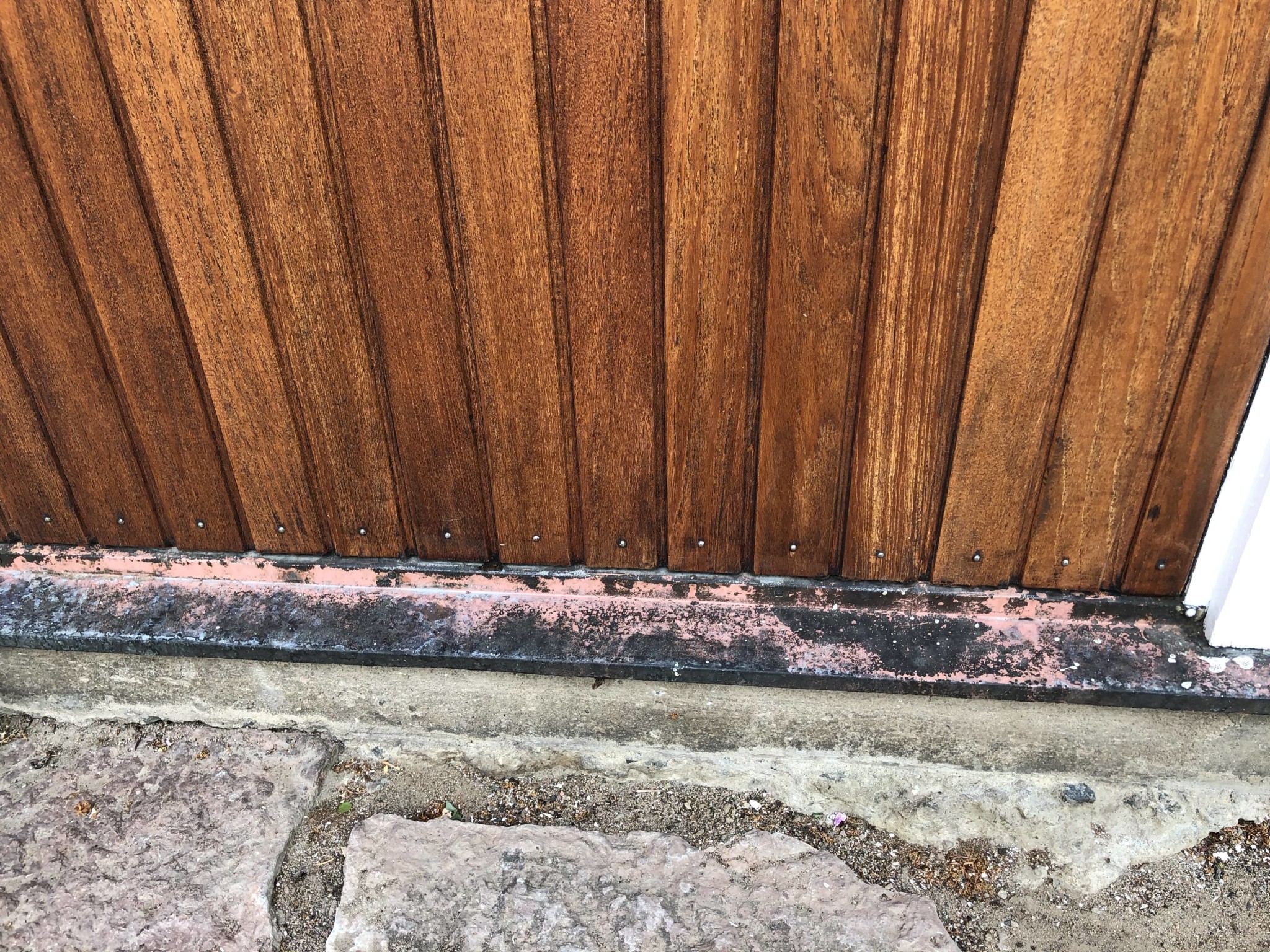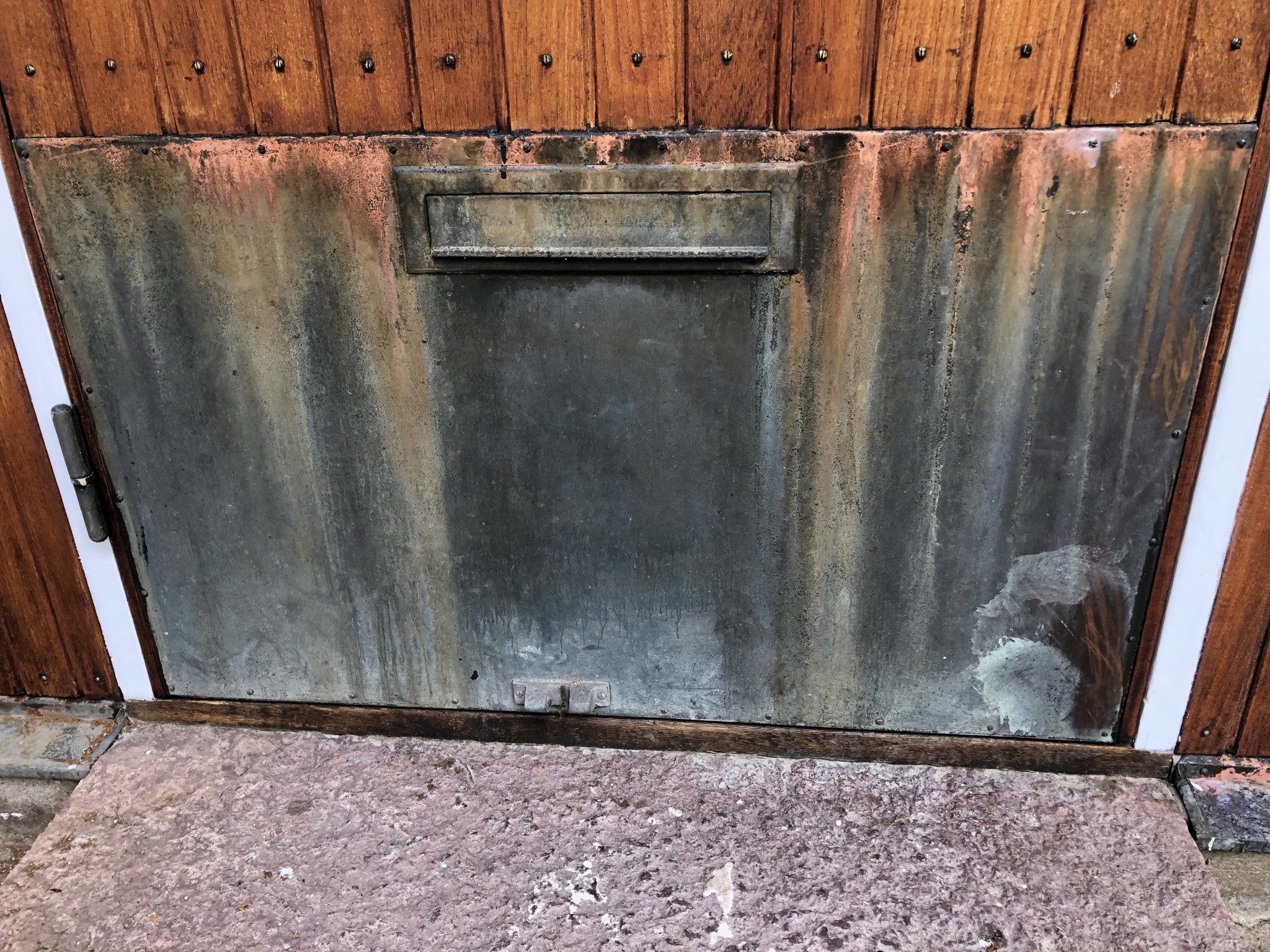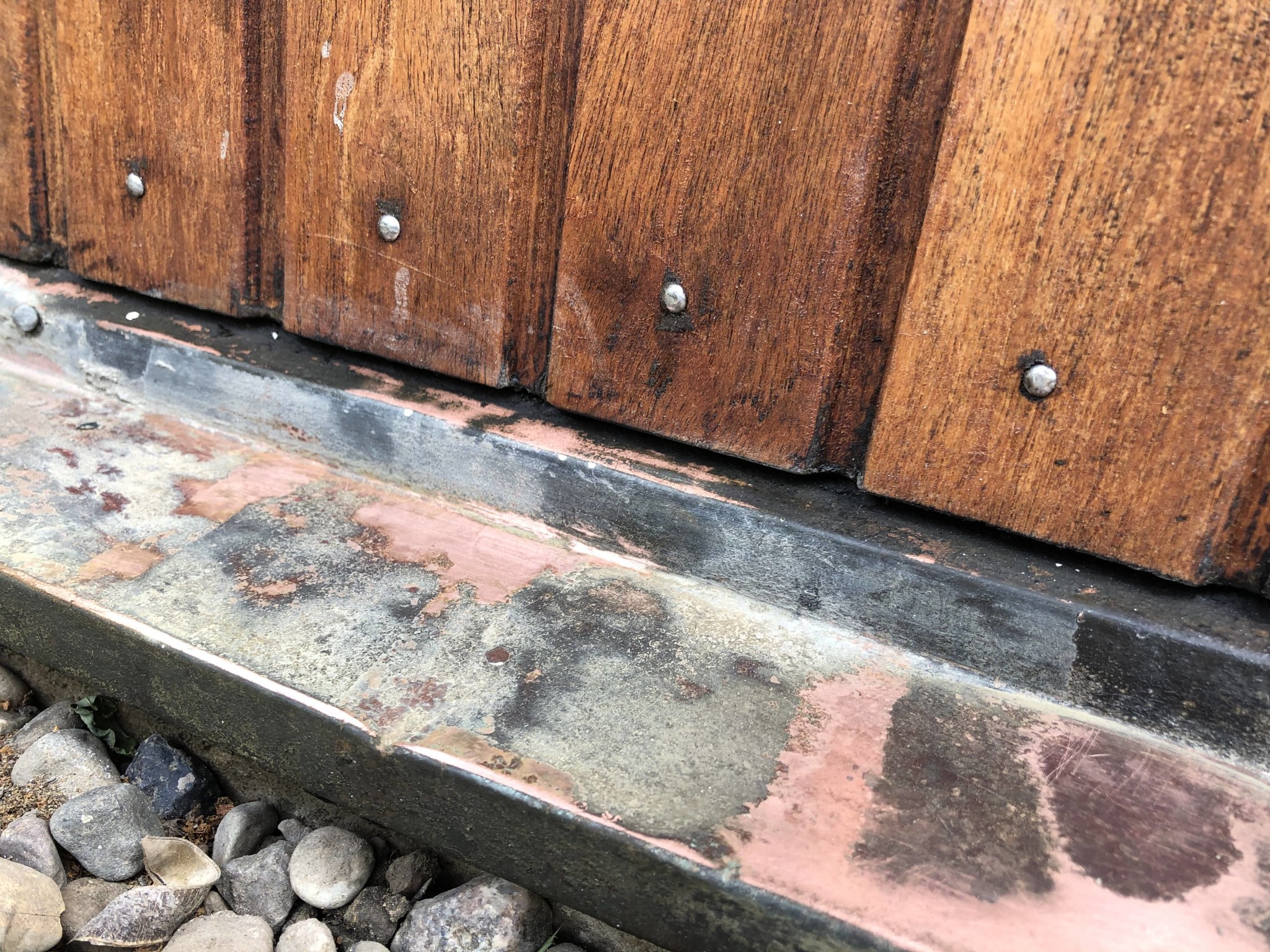 Vi har en teakdörr från ca 60-talet som har en kopparplåt nertill. Den har förmodligen inte ägnats en tanke de senaste 20 åren, därav ärgad och allmänt tråkig uppsyn. Detta gäller även dropplåt/fönsterbleck.