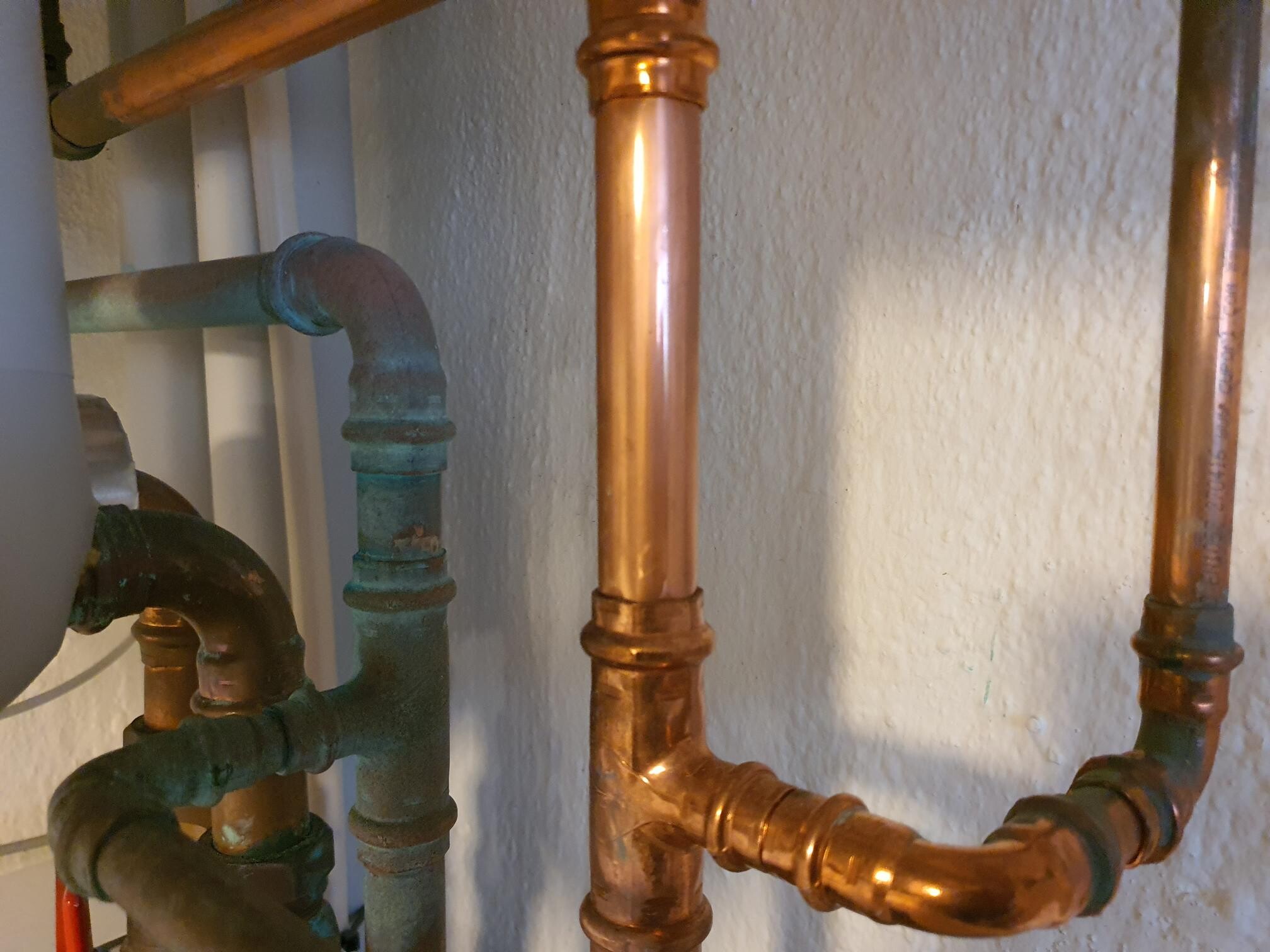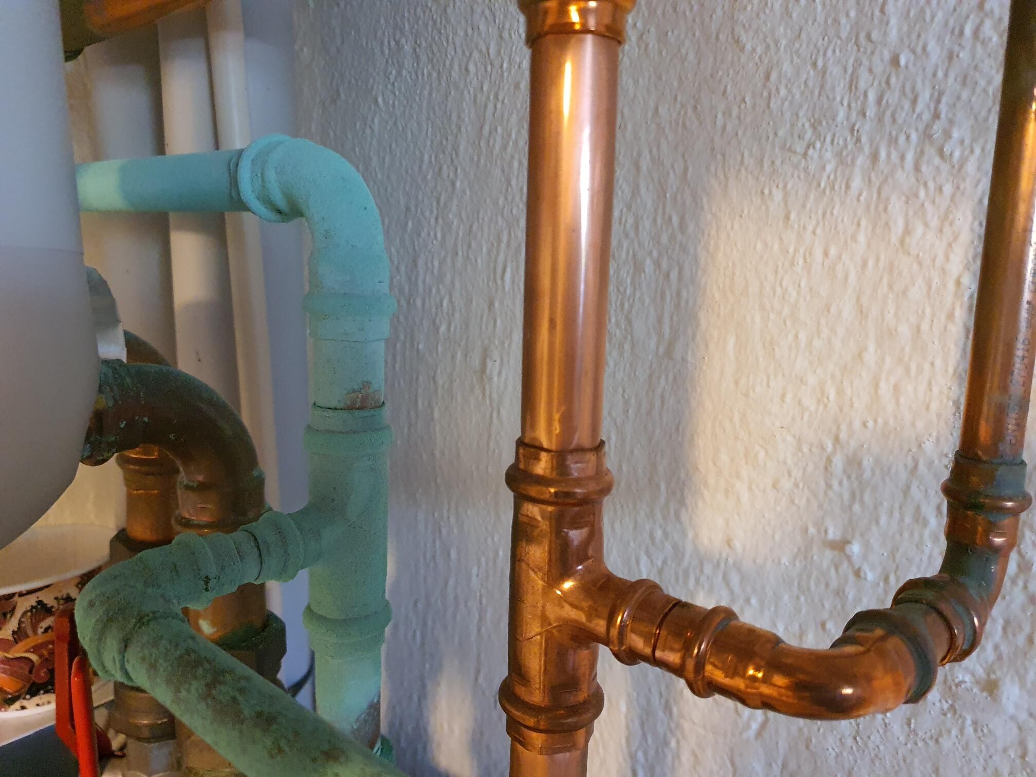 Plötsligt har vissa vattenrör av koppar blivit gröna av ärg (men vissa är helt opåverkade). Dessa rör går ut från värmeväxlare för fjärrvärme. I samma rum som värmeväxlaren sitter har jag förvarat kemikalier till poolen. Har sett att en plastbehållare med klor gått sönder, så jag misstänker att det är klor som har förorsakat ärgen.