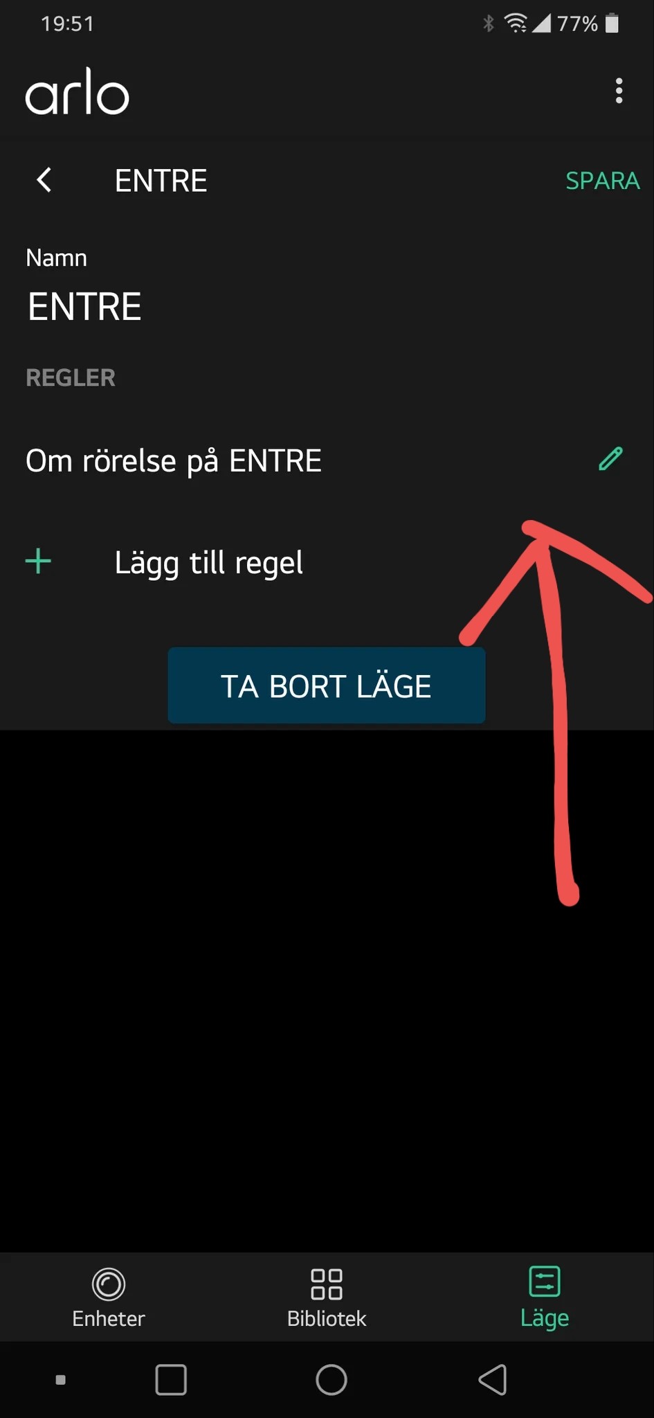 Skärmdump av en mobilapplikation med en röd pil som pekar på en knapp med texten "Lägg till regel".