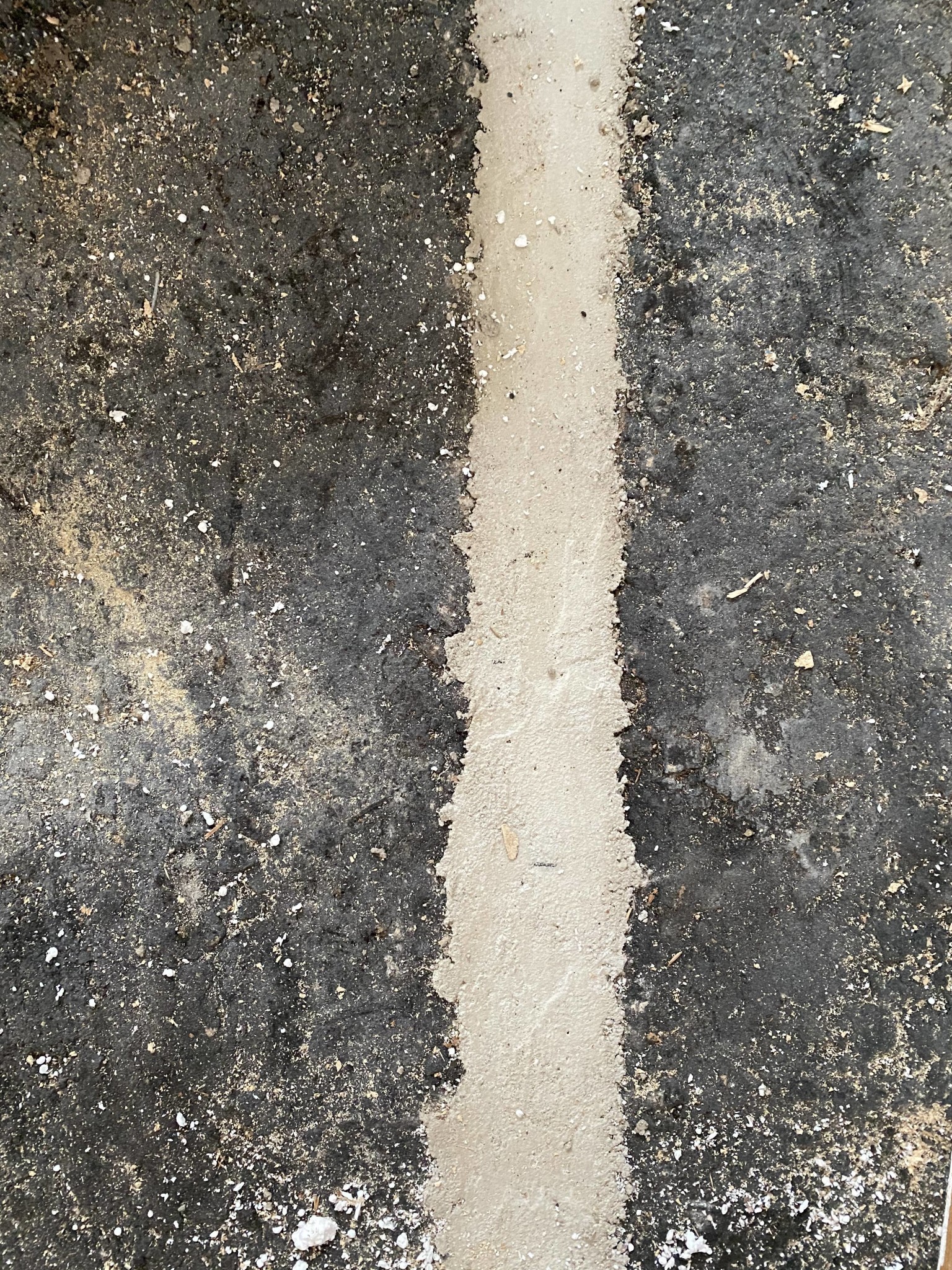 • Ojämnt asfaltgolv med spår av rivning i en renoverad källare.