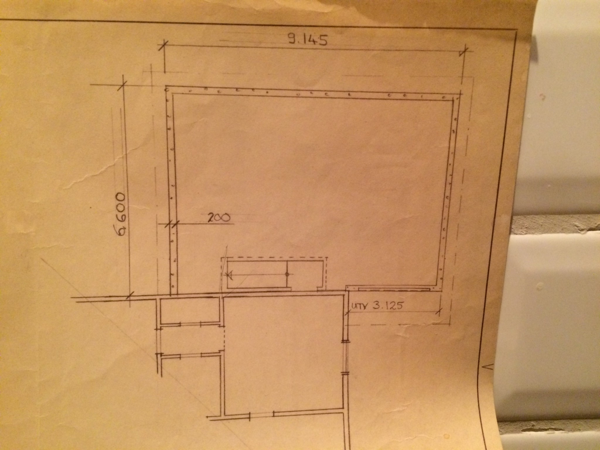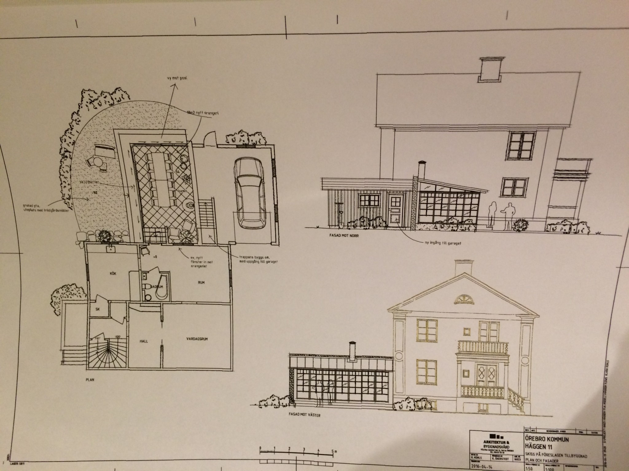 Vi ska nu bygga en pool längst in i trädgården. Vi önskar också bygga till ett uterum på norrsidan för att få en naturligare utgång från köket ut mot trädgården via uterummet och även få uppsikt över poolen. Problemet är att garaget ligger åt detta håll. Vi kan tänka oss att ta en del av garagets yta för att använda till uterummet. Vi vill också ha kvar trappen från källaren upp i garaget. Vi har varit hos en arkitekt och fått detta förslag. Det innebär dock att vi måste helt bygga om källartrappen, är detta möjligt och i sånt fall är det någon som vet hur mycket det kan tänkas kosta???? Vi tycker nog att uterummet är i minsta laget men det kanske man kan lösa genom att bygga ut det mer åt väster.