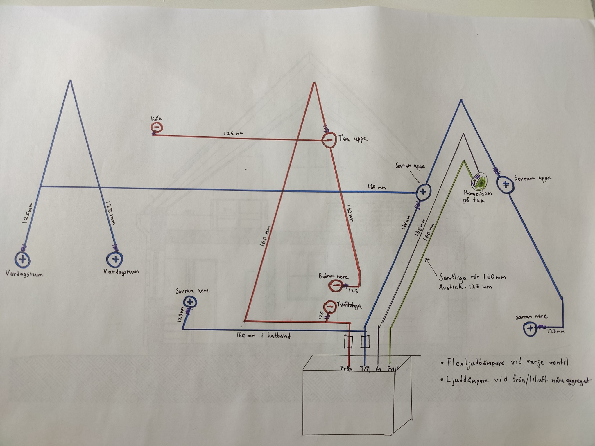 Funderingar jag haft är om jag har använt rimliga dimensioner på rören, är dragningen vettig, isoleringsstrumpa på alla rör som inte ligger i lösullen i fackverket eller även där? Samt om kombihuv är mitt bästa alternativ.