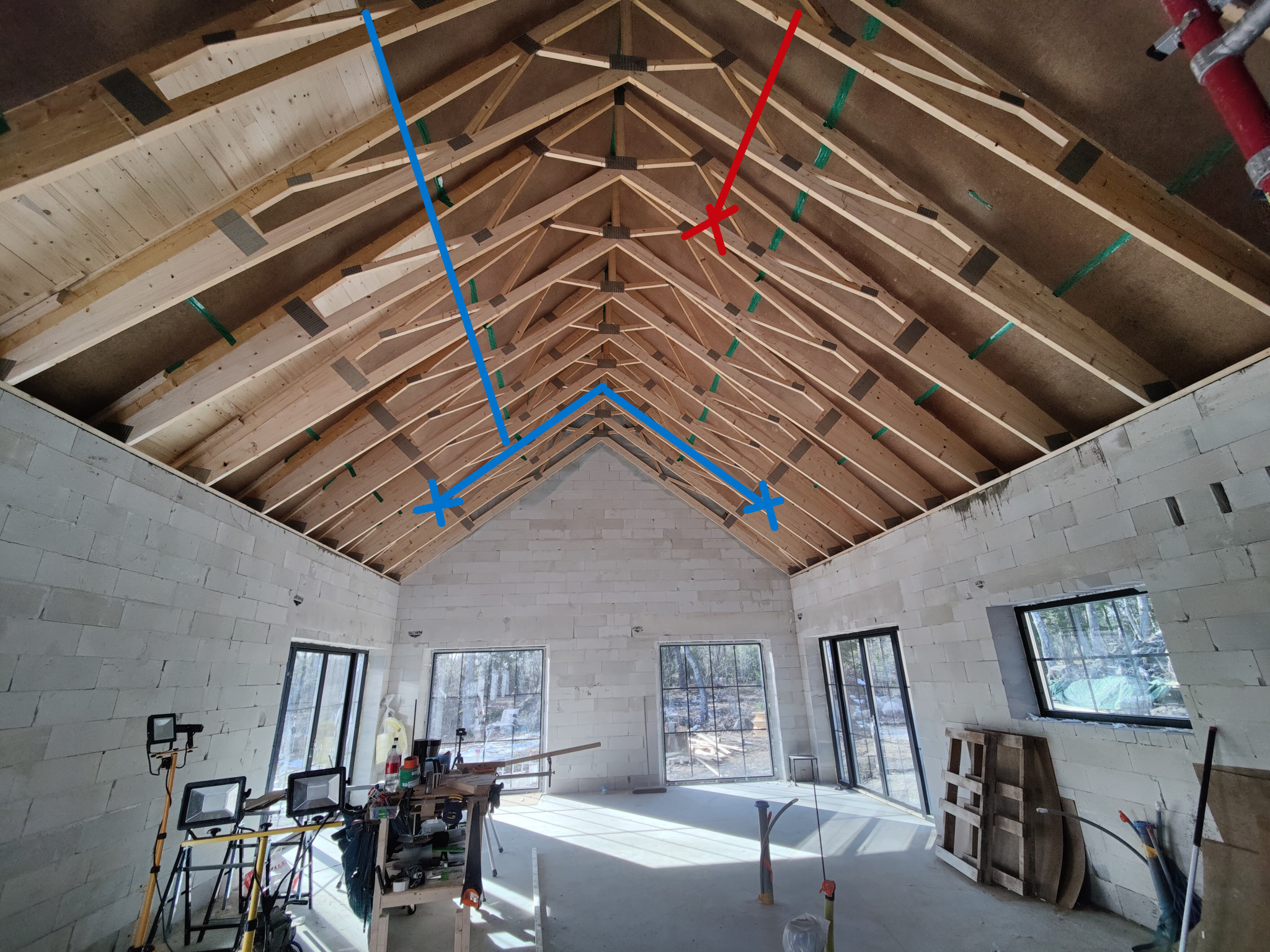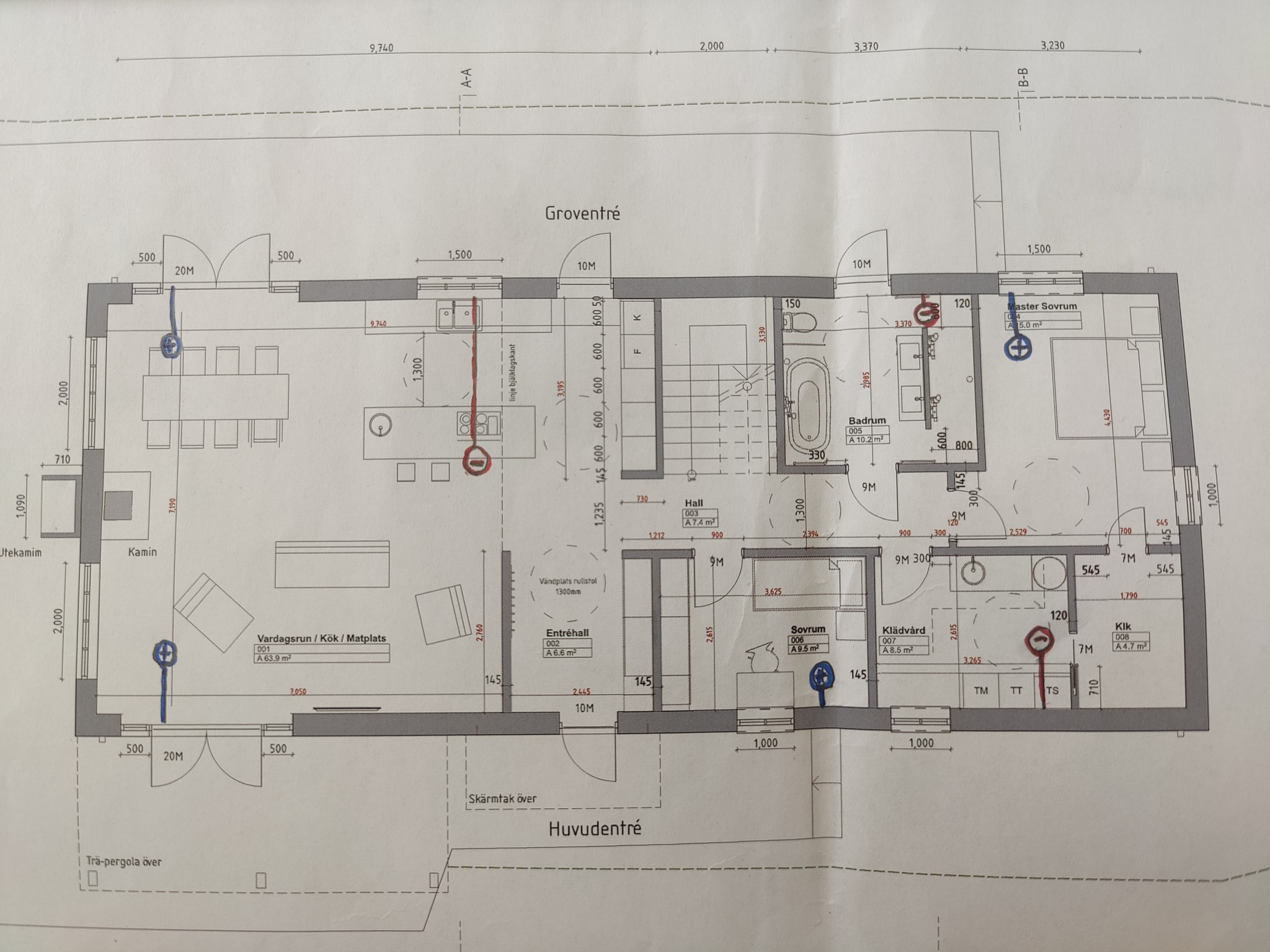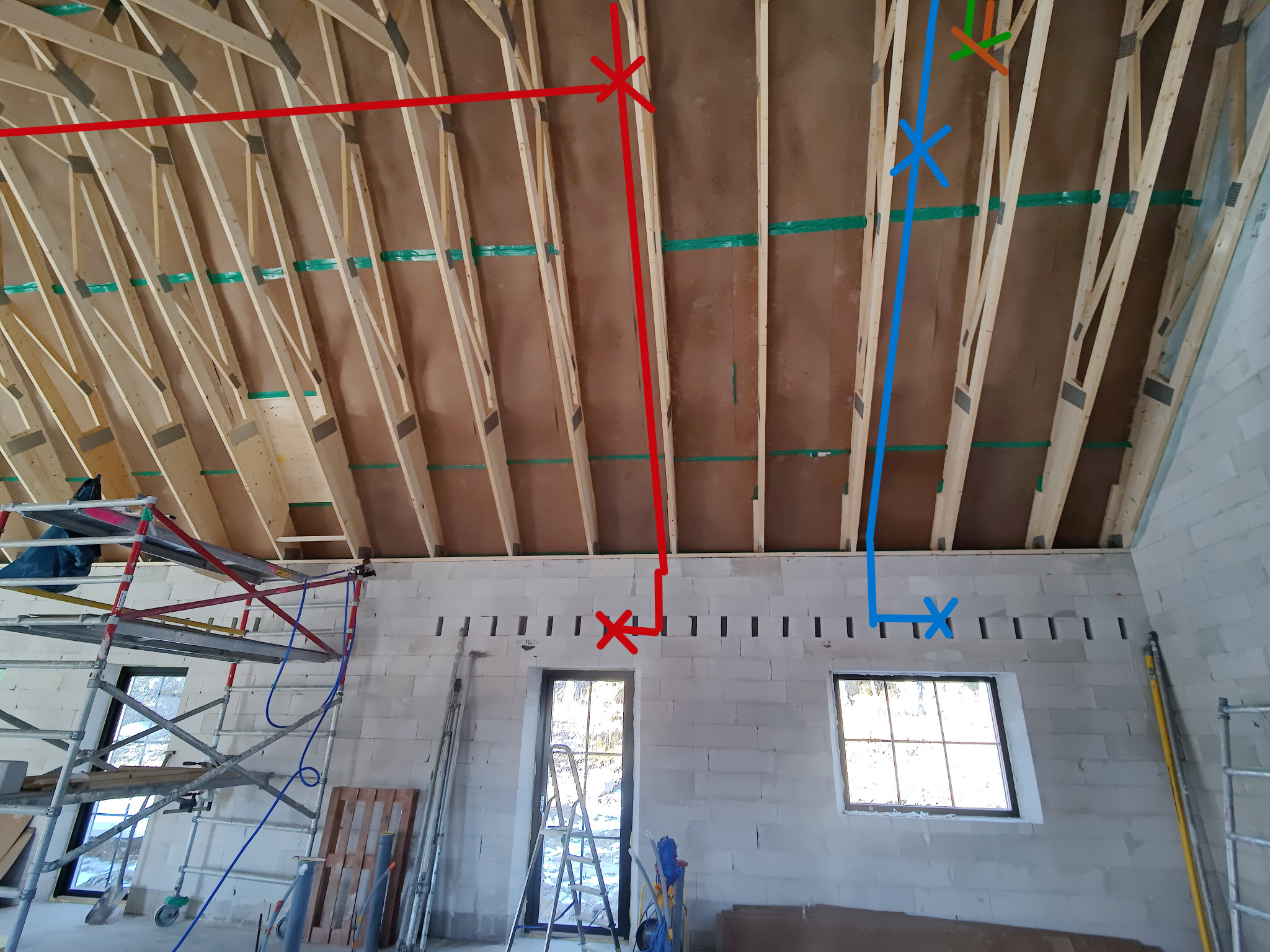 - Halva huset öppet i nock (vardagsrum/kök). Halva är loft med planering för framtid rum. Köksfläktens imkanal går ut i spirorör i plattan.