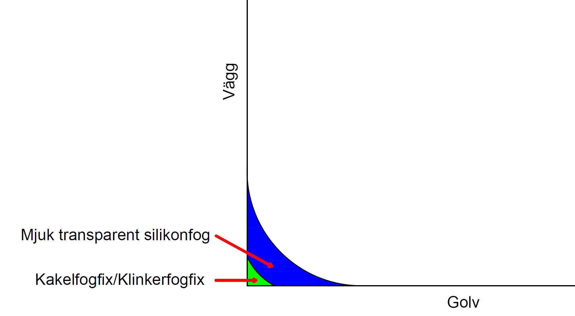 Jag gjorde ett snitt i AutoCAD på hur det verkar se ut vid golvet/vecket. Det verkar vara kakelfog/klinkerfog längst in (markerat i grönt) som går lite uppåt. Och sedan på detta har man satt mjuk silikonfog (markerat i blått). Då är det ju i princip redan kakel/klinkerfog i hörnen Jonatan79? Då kanske ett perspektiv är att man tar bort silikonfogen och inte lägger på någon ny?
