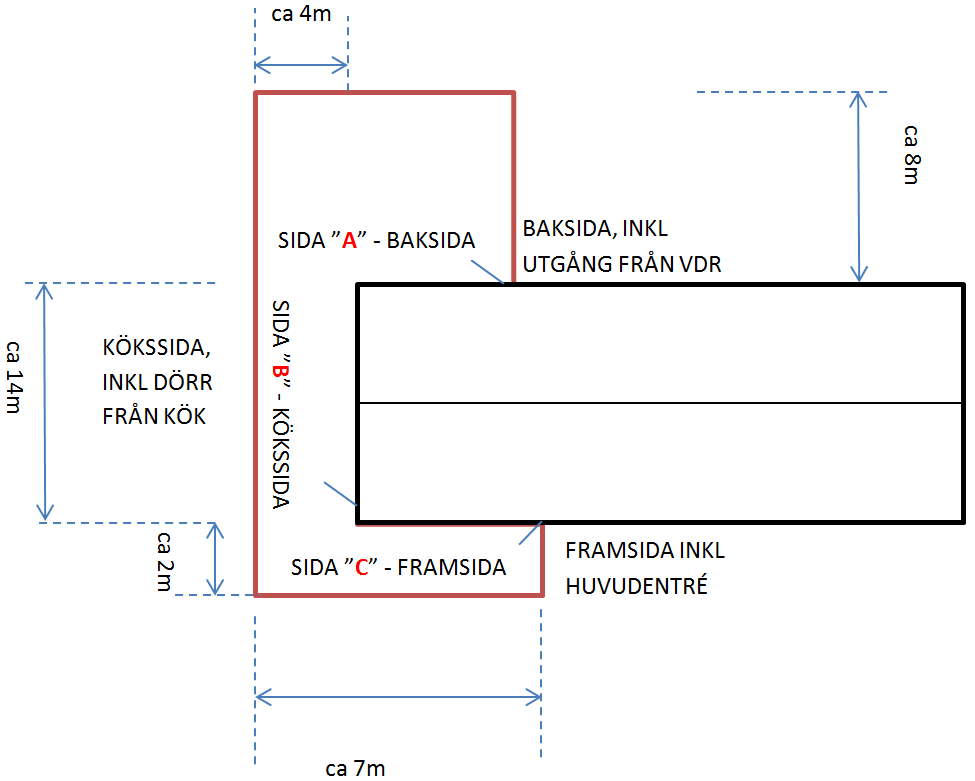 På fasaden av sida B avser jag att sätta en bärlina mot fasaden i syfte att lägga trallen parallelt med sida B (kökssidan). Vidare avser jag att använda mig av betongplintar och kompletterande bärlina där bredden/djupet på däcket kommer att överskrida 2.