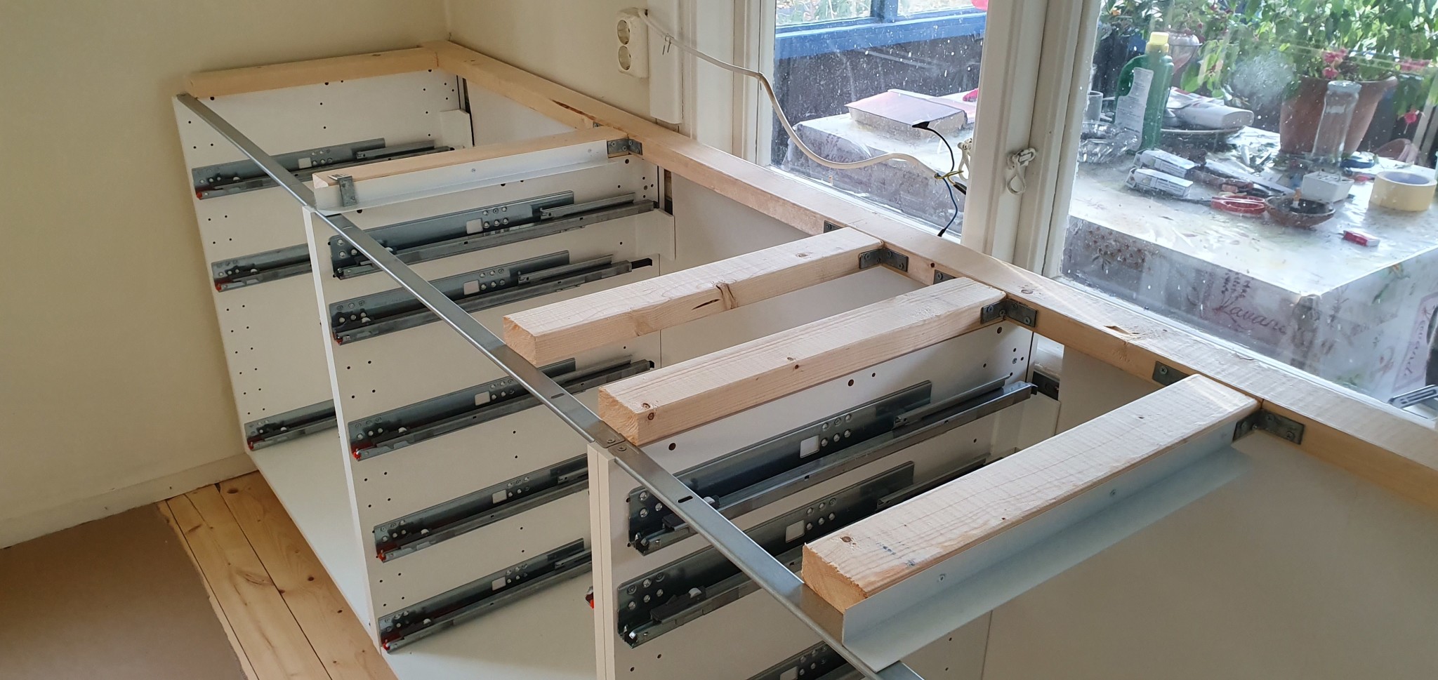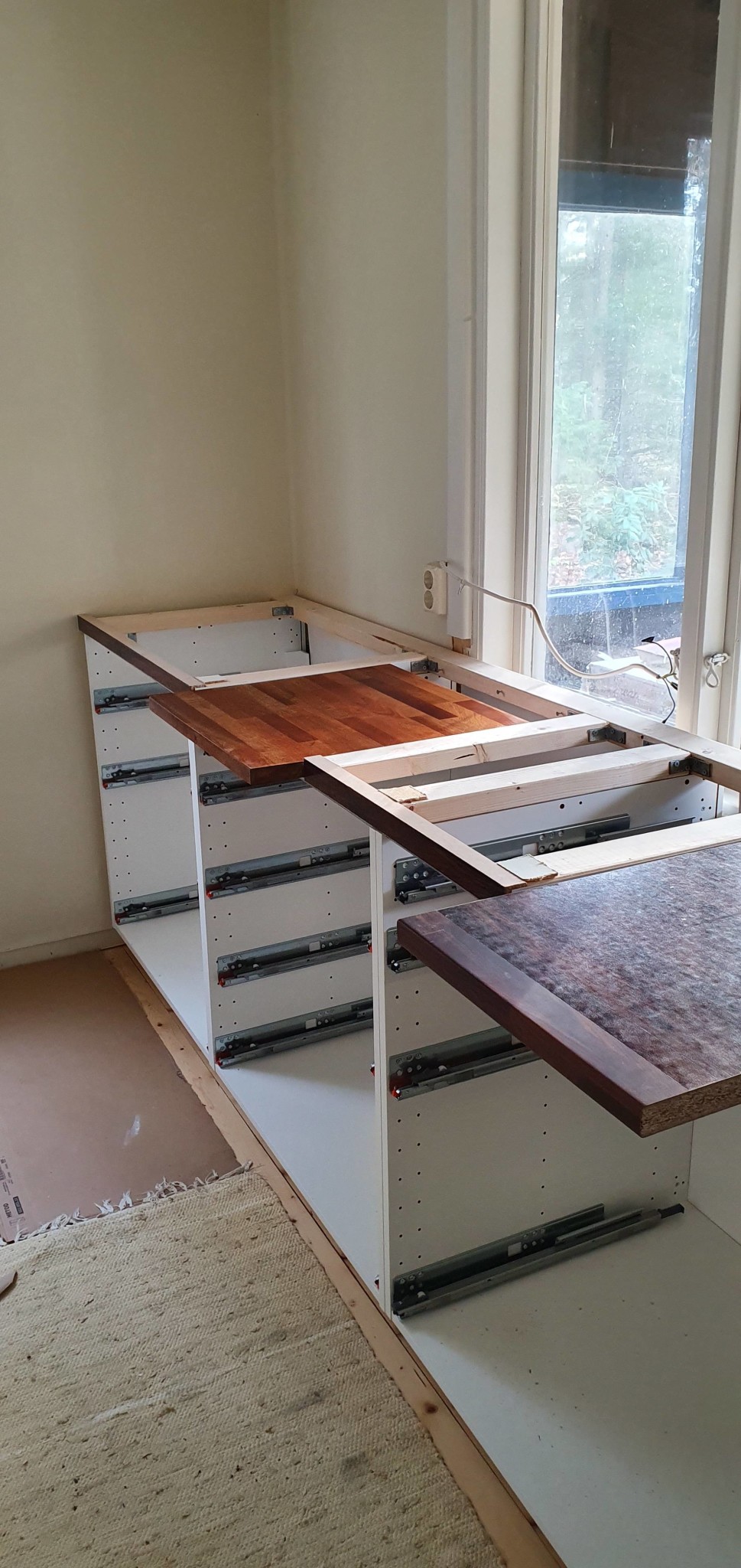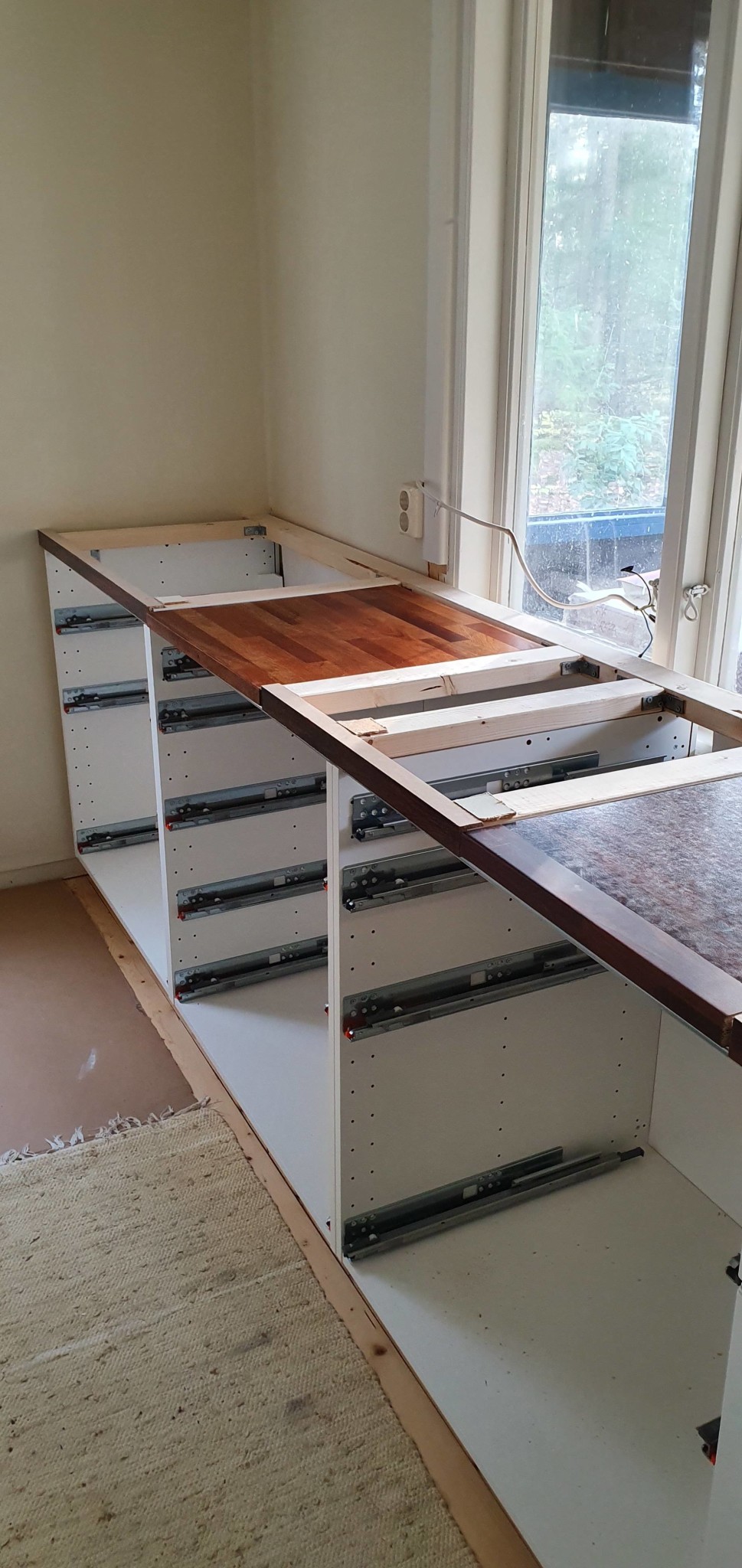 Jag har byggt det en gång förut, men denna gång var det krångligare. Dels för att det estetiska var viktigare denna gång, dels för att Ikeas stommar nu bara har en stålkant upptill ist.f. en brädkant som de hade förut. Förra gången använde jag inte L-lister, det behövdes inte, men nu har de ju inget att vila på annars.