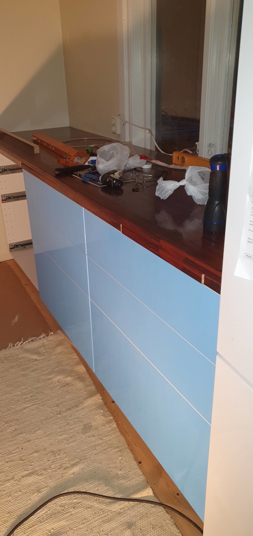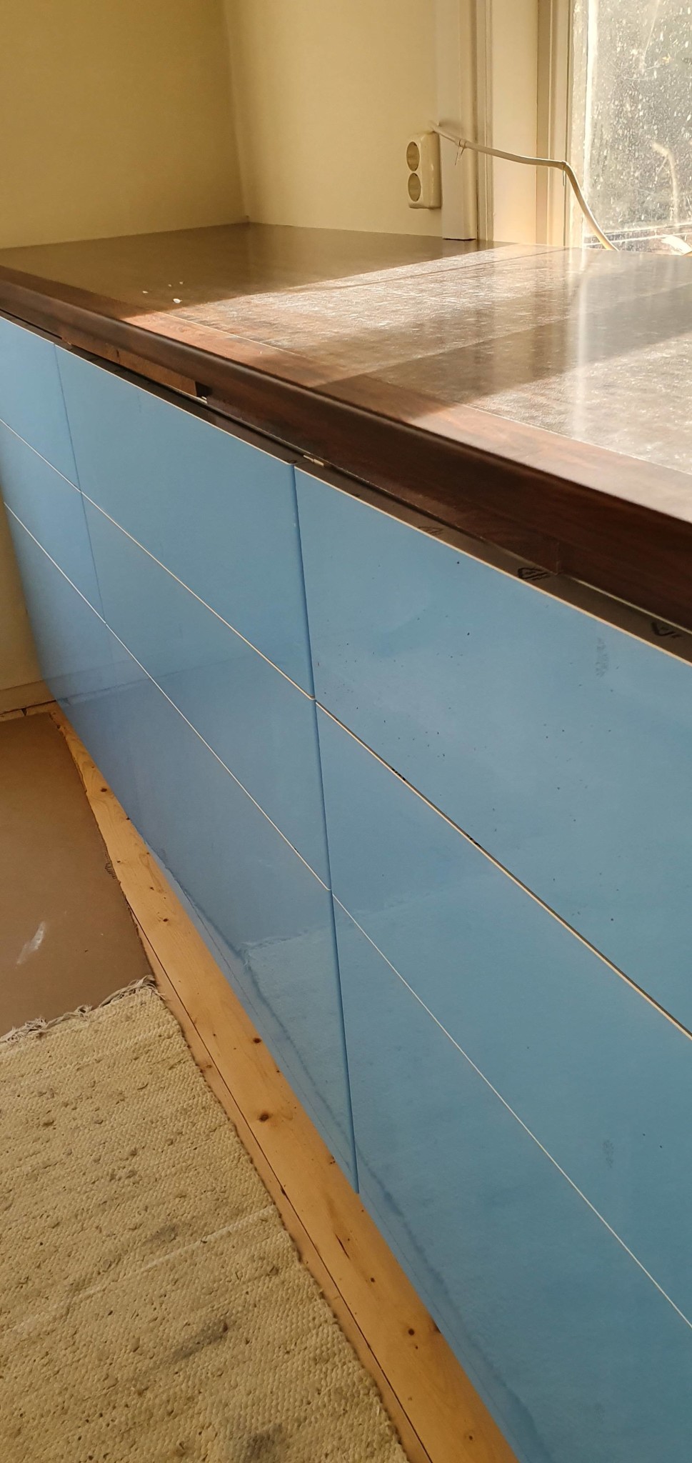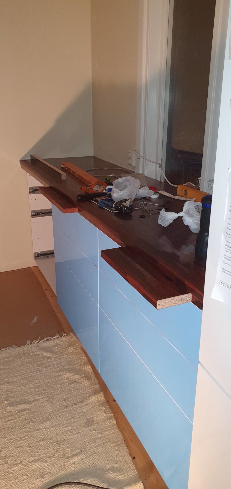 Det största misstaget var att göra regeln i bak längs hela vägen. Vi borde ha lämnat öppet bakom skärbrädorna, för då hade de kunnat vara 7 cm längre vilket hade varit bra. Om jag inte hade hunnit kapa skärbrädorna hade jag gjort om det på en gång, men nu får det vara som det är. Om jag stör mig för mycket på att dessa är kortare än de jag hade innan så får jag göra om det sedan.