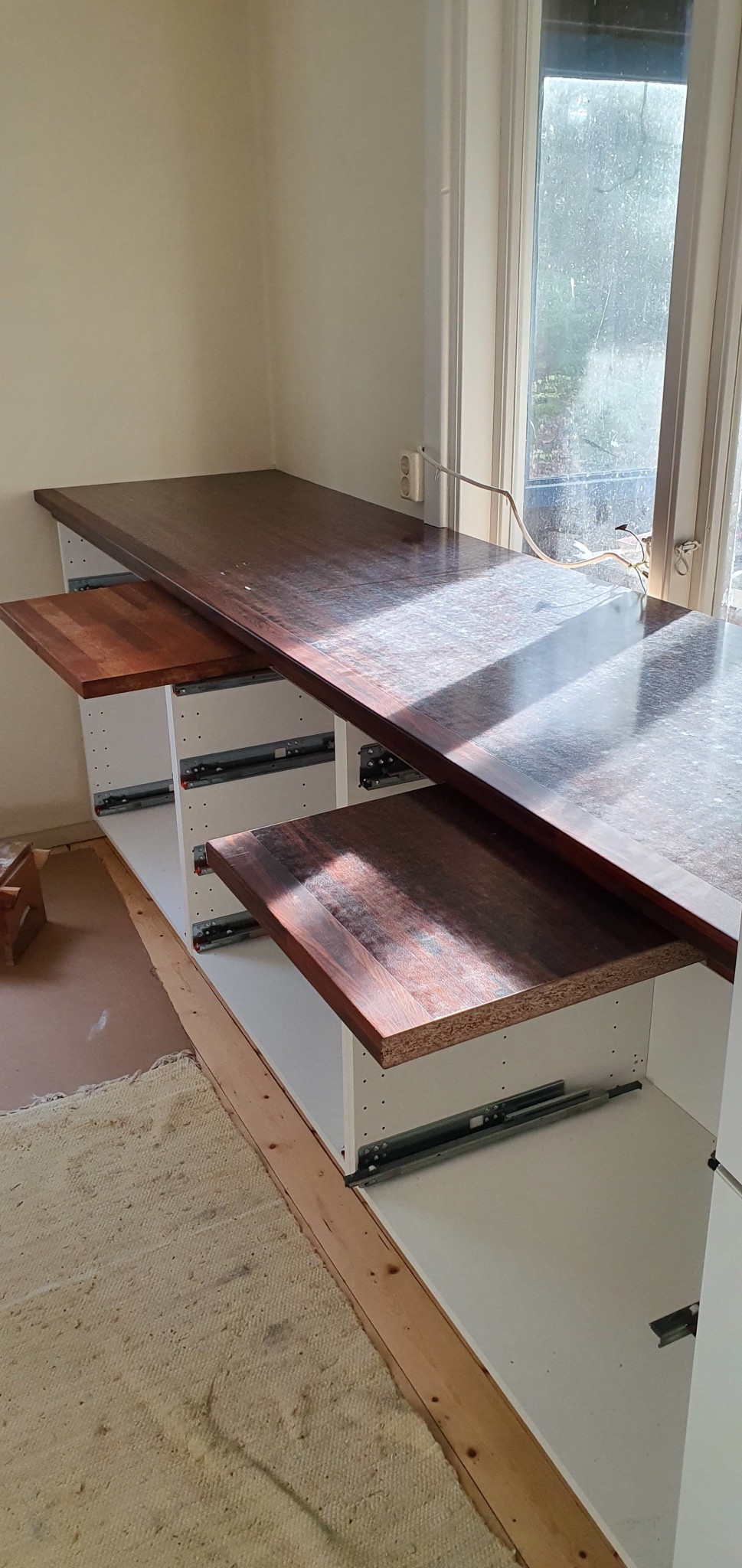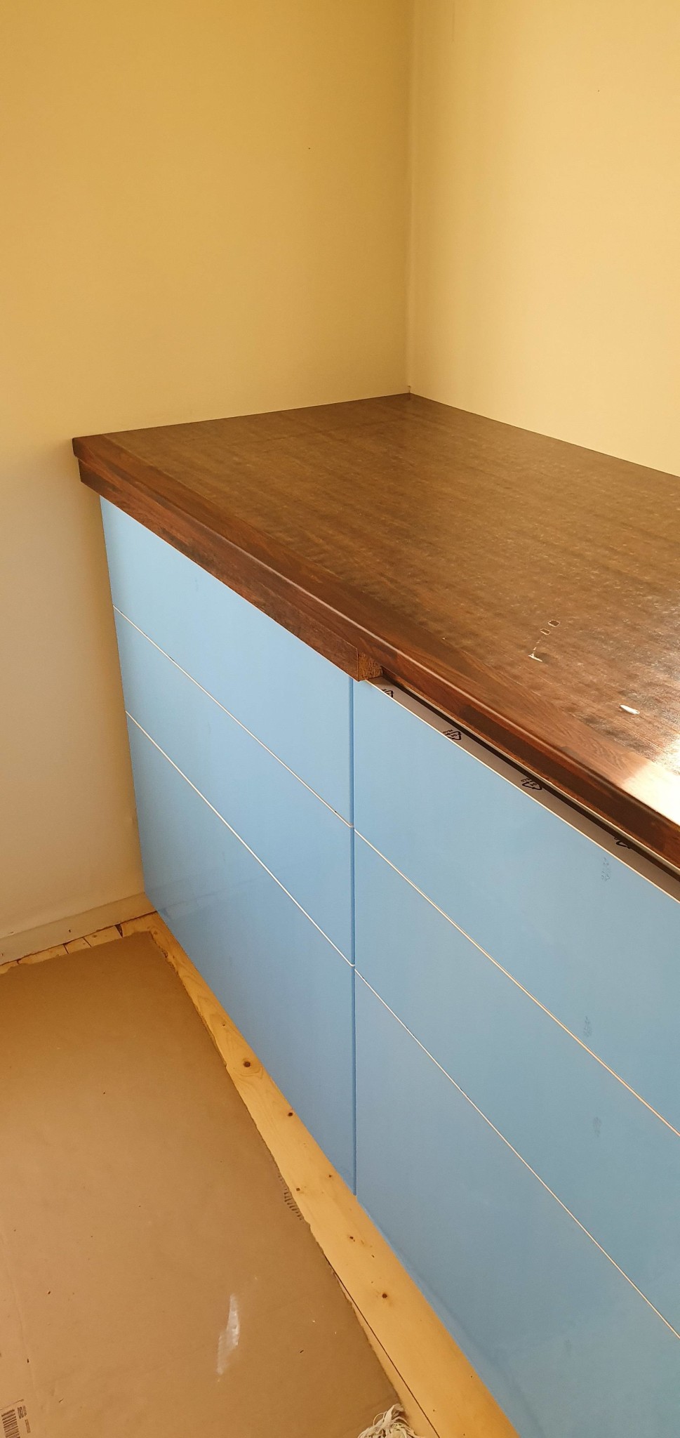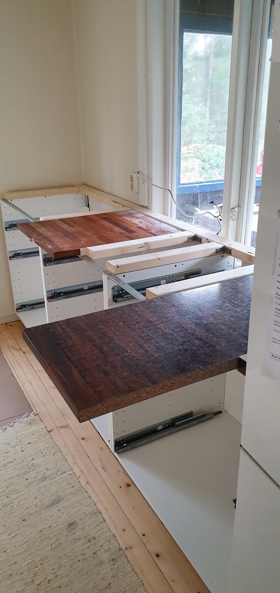 Det största misstaget var att göra regeln i bak längs hela vägen. Vi borde ha lämnat öppet bakom skärbrädorna, för då hade de kunnat vara 7 cm längre vilket hade varit bra. Om jag inte hade hunnit kapa skärbrädorna hade jag gjort om det på en gång, men nu får det vara som det är. Om jag stör mig för mycket på att dessa är kortare än de jag hade innan så får jag göra om det sedan.