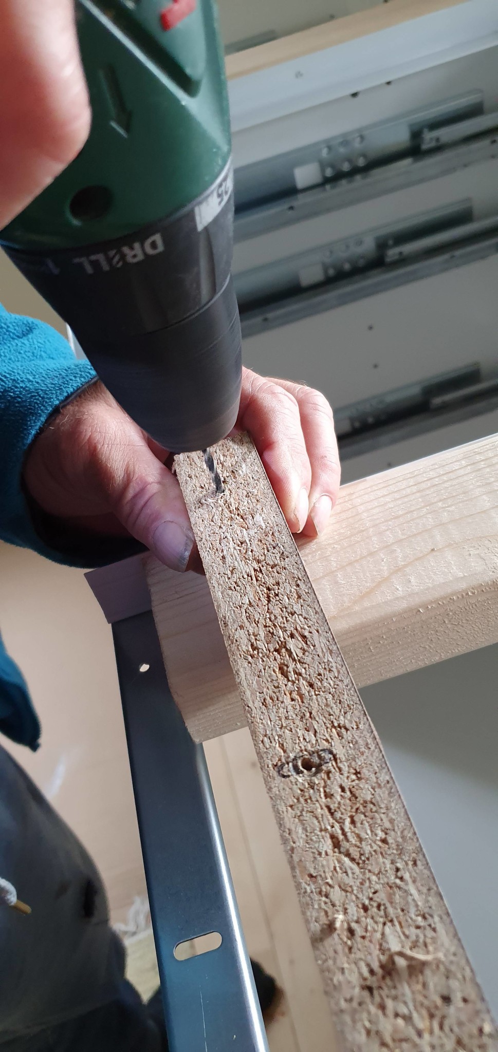 Först monterade vi en regel 70*34 längs hela baksidan. 70 bred för att kunna fästa dels i skåpsstommen (de förberedda hålen), dels fästa ramen vid bänken. 34 tjock för att bänkskivan (en del av den blev skärbräda) är 28 mm och man behöver någon/ några mm för att kunna dra den ut och in. 34 är dock lite för mycket, men hittade inga tunnare (ca 31-32) någonstans.