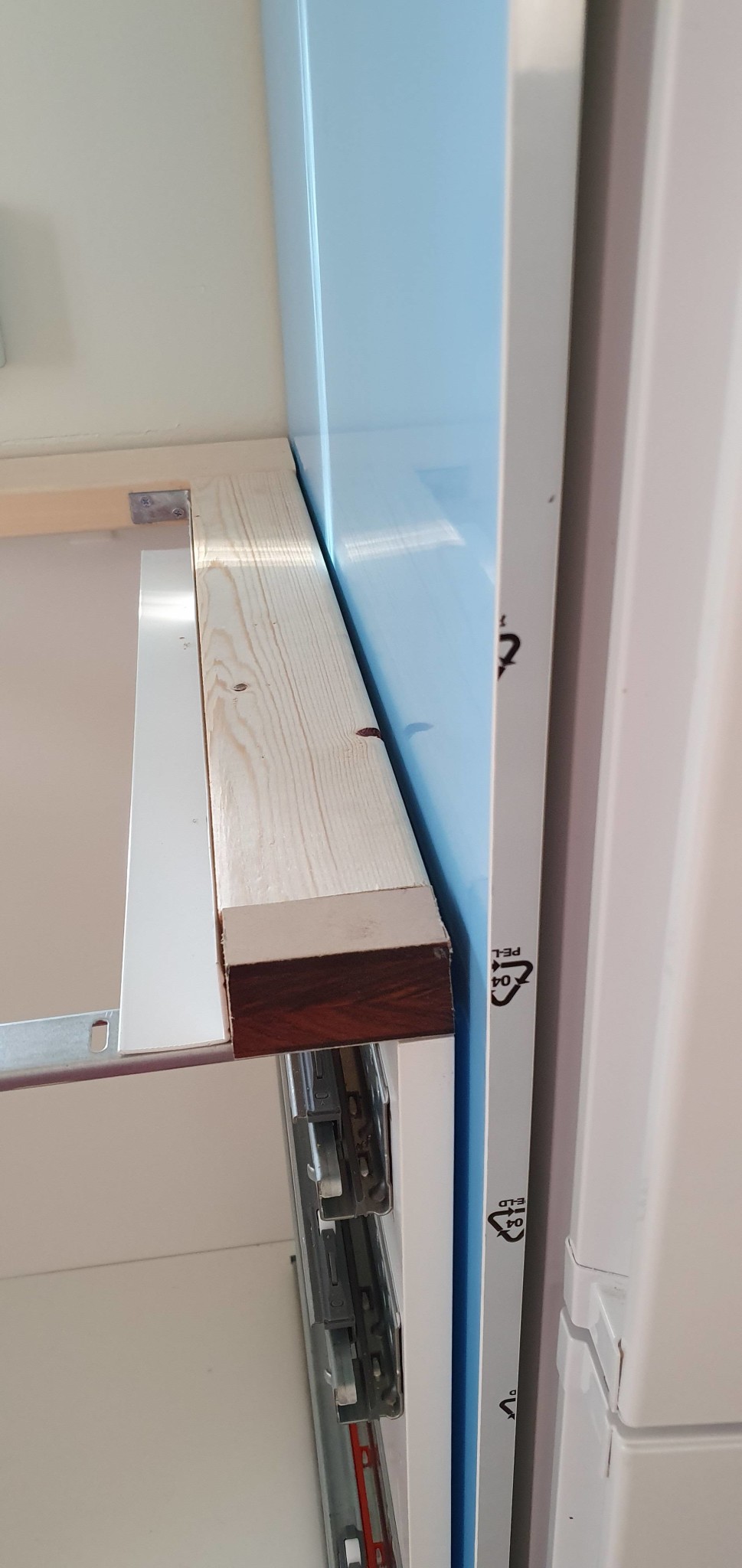 Efter det skruvade vi fast en liten list på baksidan av skärbrädorna, så baksidan nästan når bänkskivan. Annars tippar de framåt när man drar ut dem eftersom inget tar emot uppåt. Detta moment skulle man slippa om man hade U-profiler.