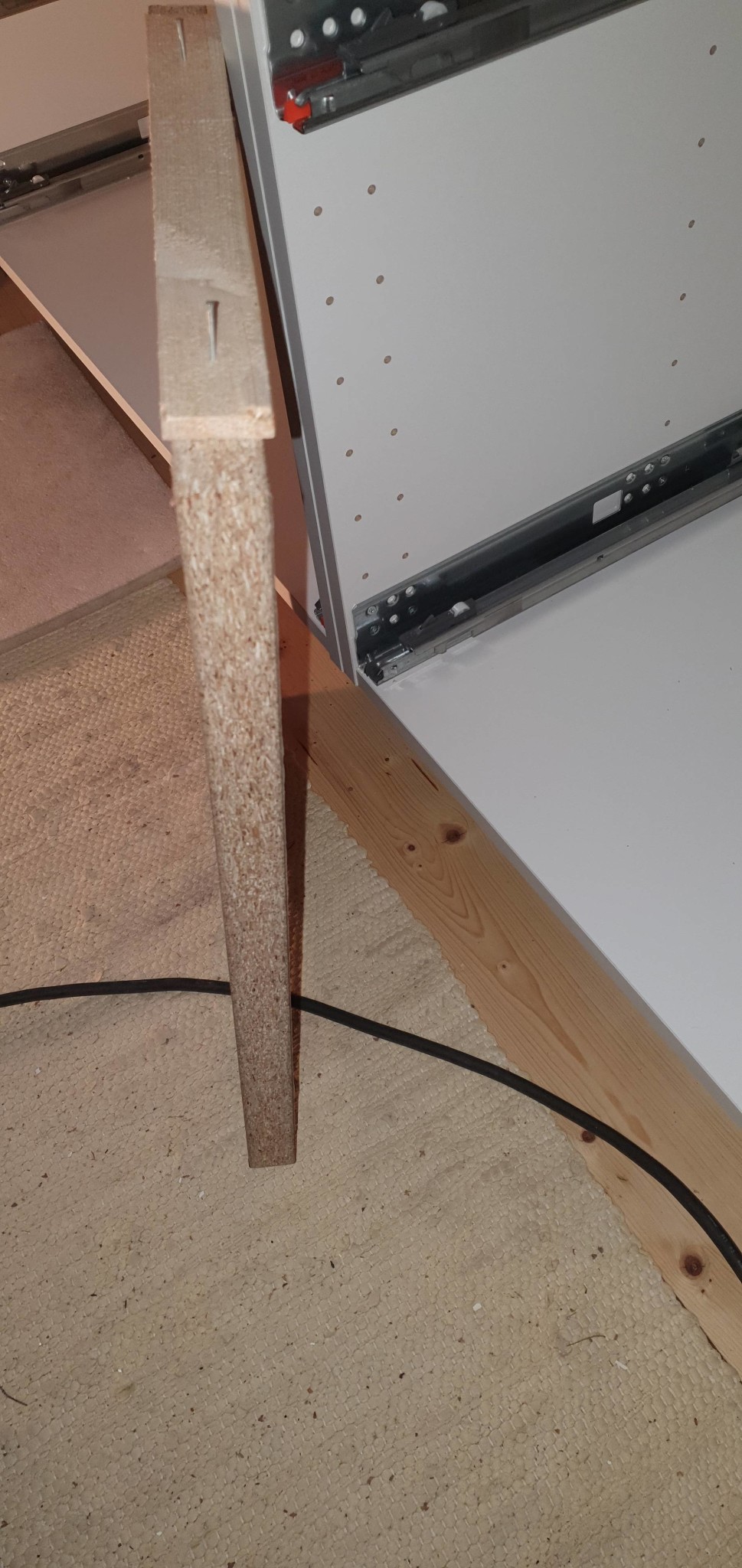 Det andra misstaget var att jag tänkte att framsidan skulle vara vid skåpstommen (det visade sig vara för långt in) Det fixades med att sätta på en till främre bit utanpå den första. (så skärbrädorna hade kunnat vara 3 cm längre, dvs totalt 10 cm längre...)