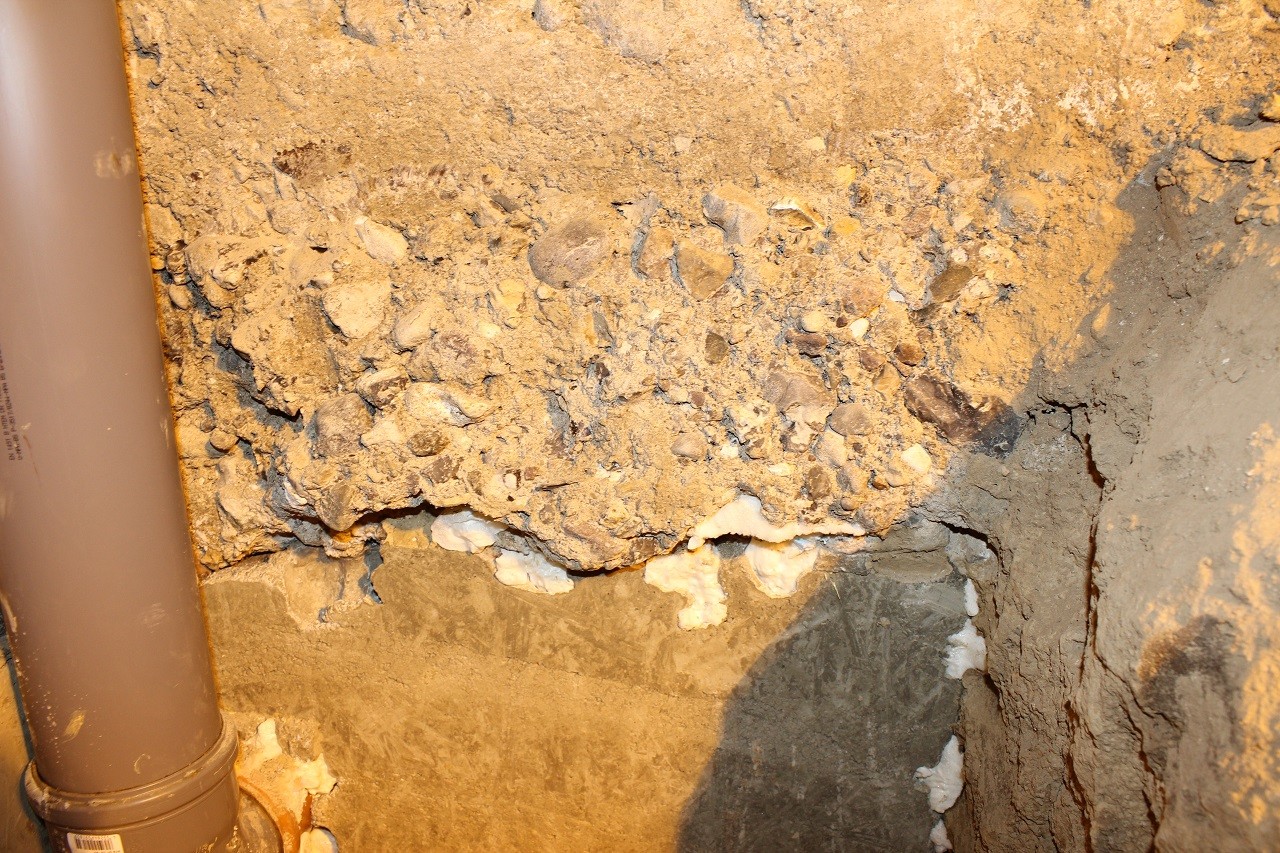 Notera att för att kunna putsa väggarna helt raka har vi fått skära och hugga gråstenen i den gamla grunden.